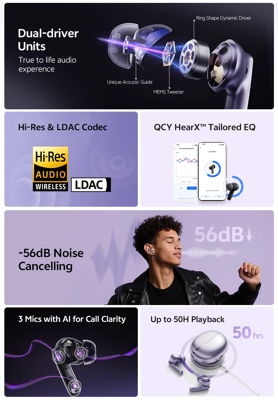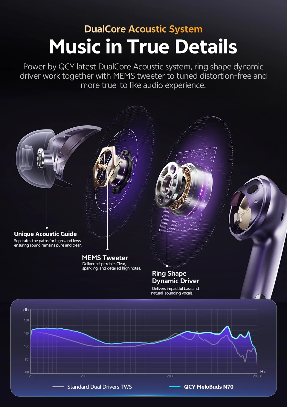 Potência do QCY mais recente DualCore™ sistema acústico, driver dinâmico em forma de anel funciona junto com o tweeter MEMS para sintonizar uma experiência de áudio sem distorção e mais real.