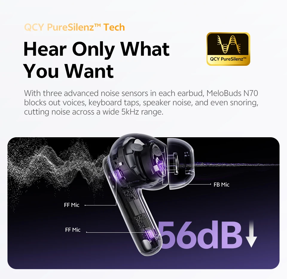 Com três sensores de ruído avançados em cada fone de ouvido, o MeloBuds N70 bloqueia vozes, toques de teclado, ruído de alto-falante e até mesmo ronco, reduzindo o ruído em uma ampla faixa de 5kHz.