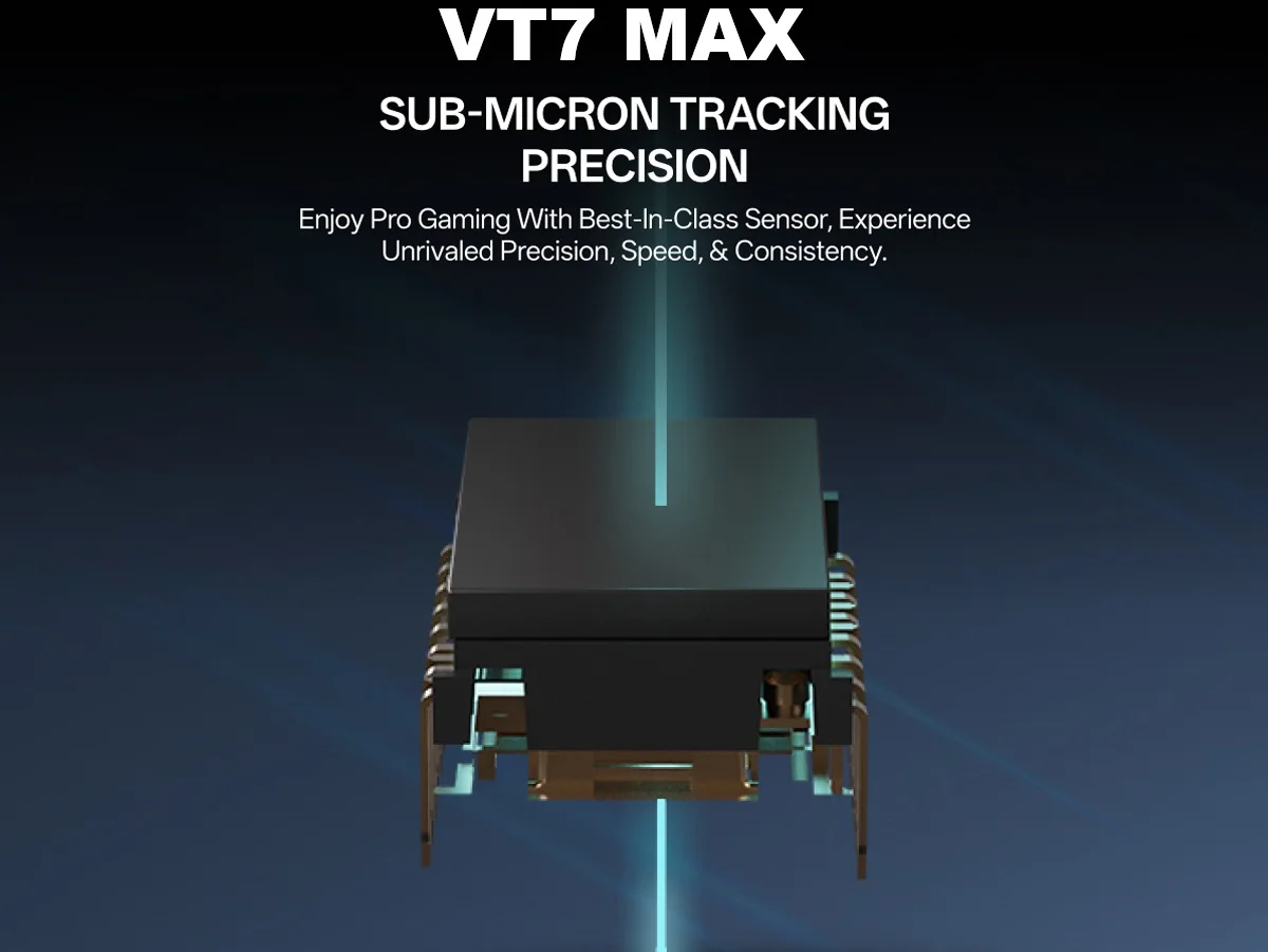 (VT7 MAX)Interruptor óptico de 120 milhões:Registrando os cliques do mouse usando luz infravermelha em vez de contato mecânico, o interruptor óptico elimina qualquer risco de cliques duplos acidentais e não tem atraso de desbounce, mas tem uma vida útil mais longa de 120 milhões.Para usuários que preferem o feedback de clique mecânico tradicional, recomendamos escolher a versão VT7 (interruptor mecânico de 1100 milhões).