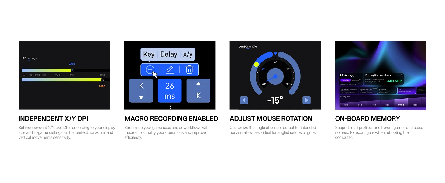 (VT7) 26K DPI X/Y independente / (VT7 MAX) 30K DPI X/Y independente:Desfrute de rastreamento responsivo e preciso de pixel com precisão de resolução de 99,6% e 26K DPI (VT7)/30K DP (VT7 MAX).Defina DPIs independentes do eixo X/Y de acordo com o tamanho da tela e as configurações do jogo para obter a sensibilidade perfeita dos movimentos horizontais e verticais e alterne os níveis de DPI sobre a marcha pressionando os botões DPI +/-.