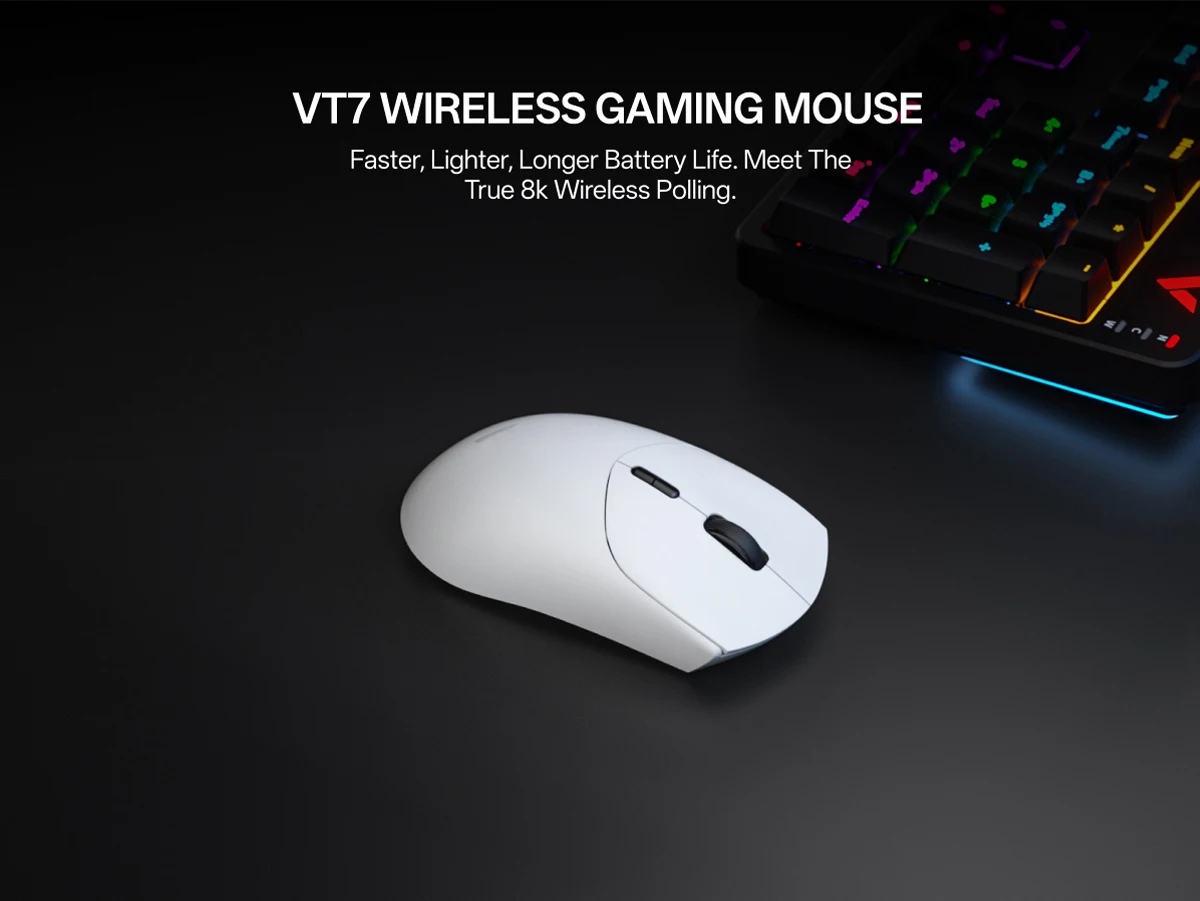 Taxa de folga sem fio True 8K: Desfrute de wireless nativo de 8000 Hz de alto nível - não contendo mais com algoritmo de software ou dongle sem fio extra, o VT7/VT7 MAX fornece um desempenho sem fio sólido de 8K, mesmo em ambientes de torneios barulhentos.