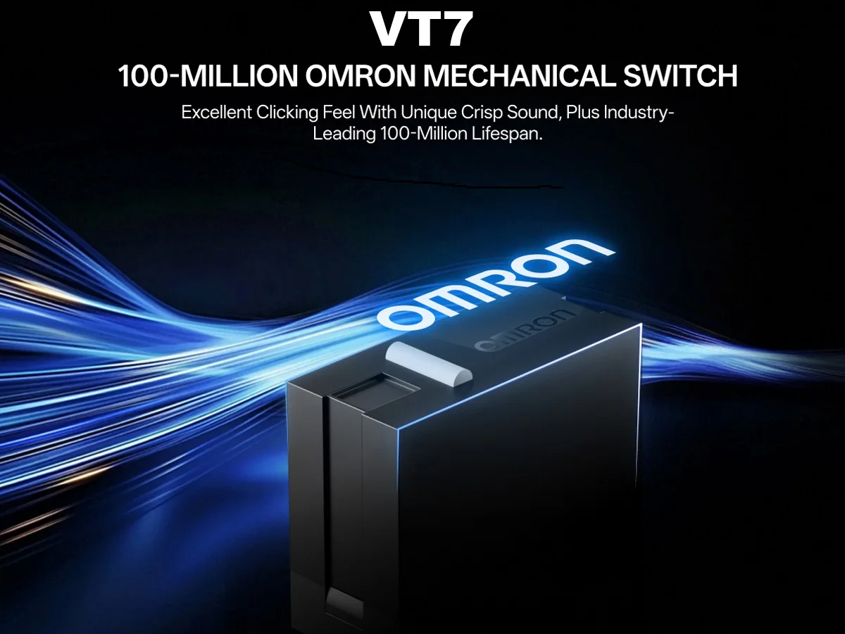 (VT7) Interruptor mecânico Omron 100 milhões: Mantém a sensação típica de clique e o som dos interruptores mecânicos do mouse, tentamos o nosso melhor para reduzir os problemas de clique duplo inerentes aos microinterruptores mecânicos - aumentando a vida útil de 60 milhões para 100 milhões.Para usuários que não se preocupam muito com o feedback de clique mecânico, recomendamos escolher a versão VT7 MAX (interruptor óptico de 120 milhões).