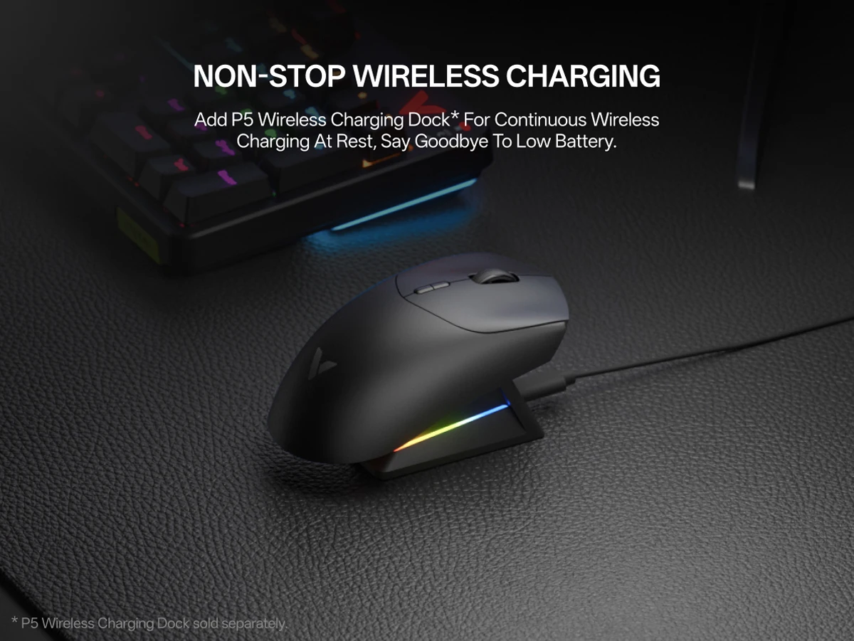 Até 750 horas de vida útil da bateria: atualizado com o MCU nRF54L15 nórdico que integra uma tecnologia sem fio de consumo ultrabaixo, o VT7/VT7 MAX consegue fazer com que o mouse para jogos sem fio não dependa mais de carregamentos frequentes - com uma duração imbatível de bateria de 750 horas a 1000 Hz.