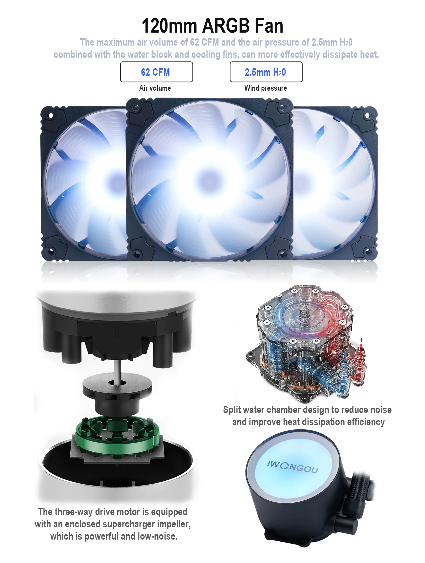 Design de câmara de água dividida para reduzir o ruído e melhorar a eficiência de dissipação de calor.