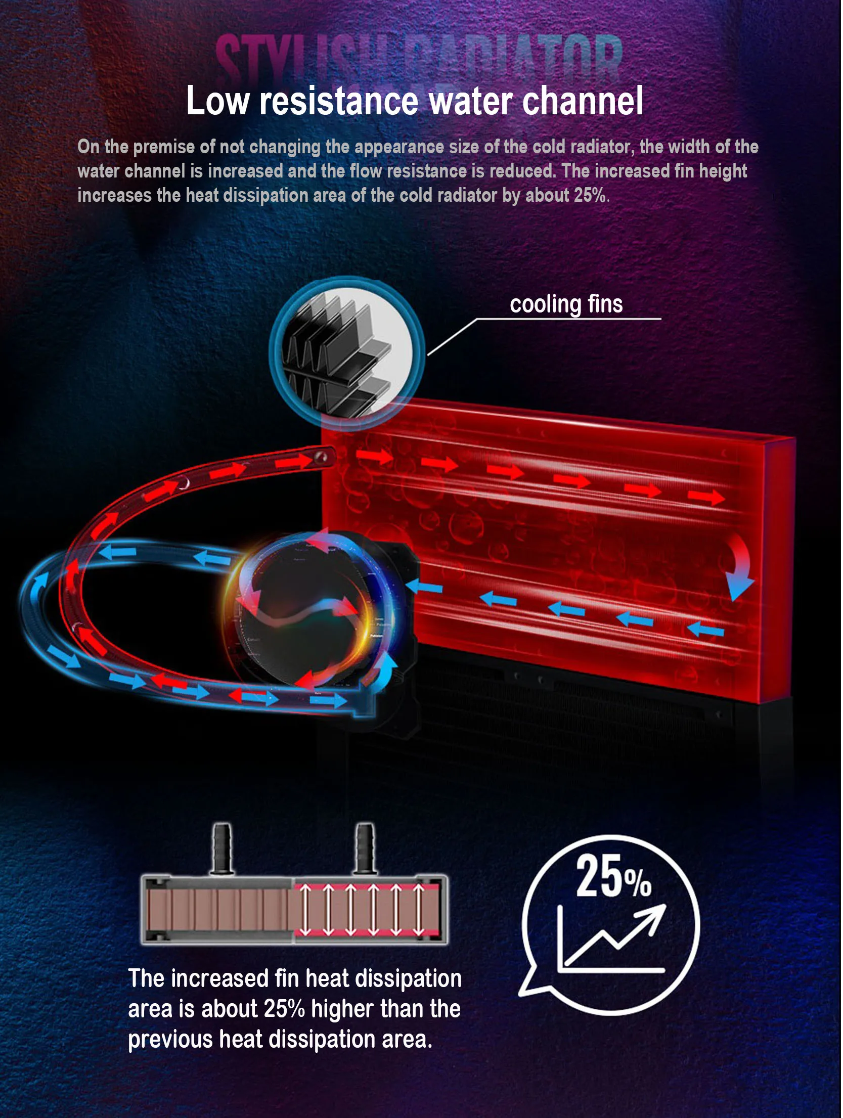 Canal de água de baixa resistência: Tendo a premissa de perceber o tamanho da aparência do radiador frio.a largura do canal de água é aumentada e a resistência ao fluxo é reduzida.O aumento da altura das aletas aumenta a área de dissipação de calor do radiador frio em cerca de 25%.