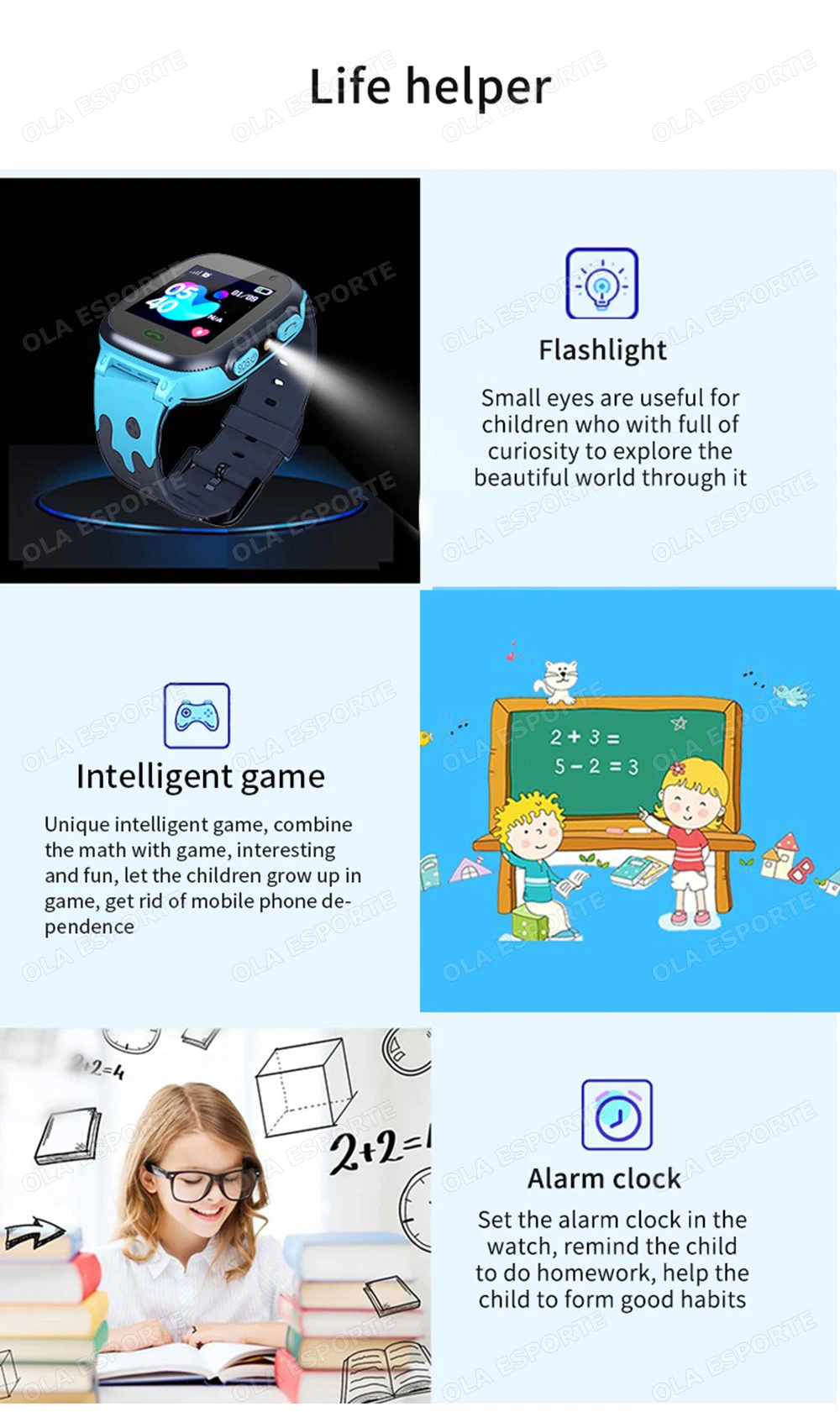 3.Multifuncional: Com a ajuda da função de câmera, as crianças podem capturar momentos inesquecíveis.A lanterna pode ajudá-lo a iluminar o ambiente escuro.Os jogos matemáticos também podem torná-los felizes e ajudar as crianças a desenvolverem sua inteligência.