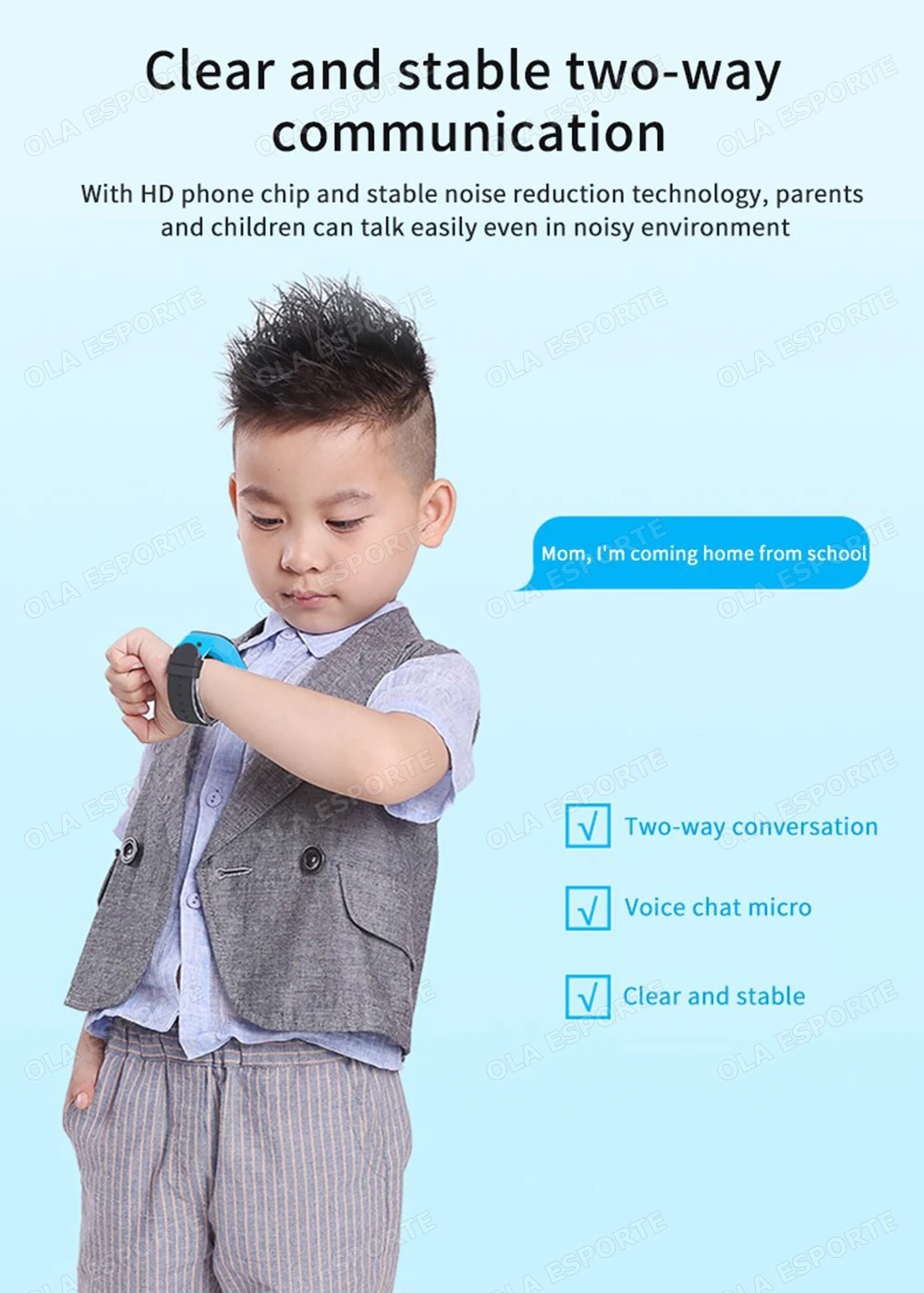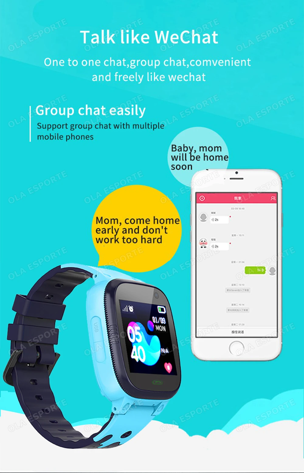 2.Comunicação bidirecional: Contanto que o pai defina o número de contato na lista telefônica do APP, a criança pode fazer e receber chamadas.As crianças também podem usar a função de bate-papo por voz para enviar mensagens de voz aos pais, e os pais podem enviar mensagens SMS e de voz de volta.