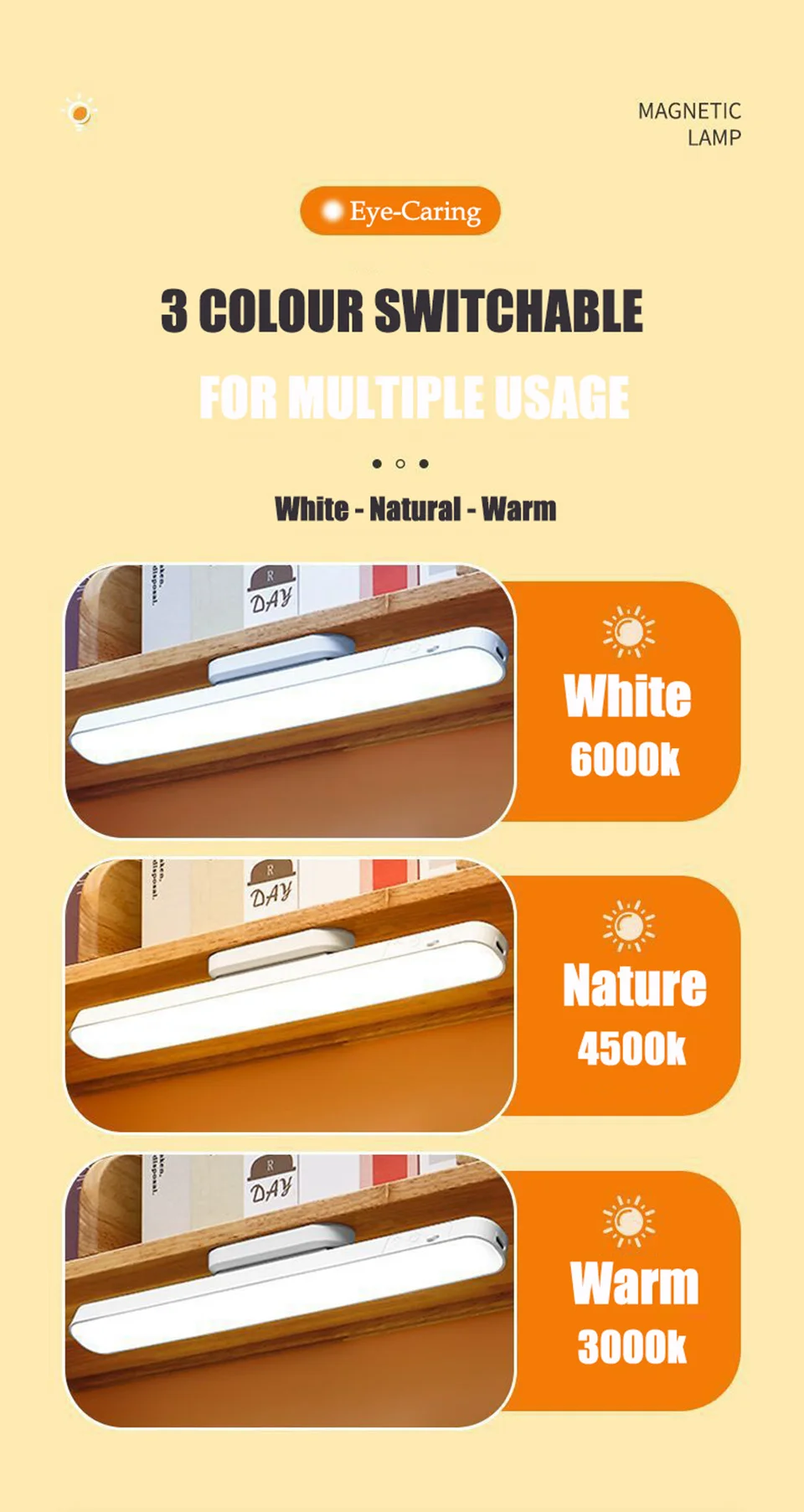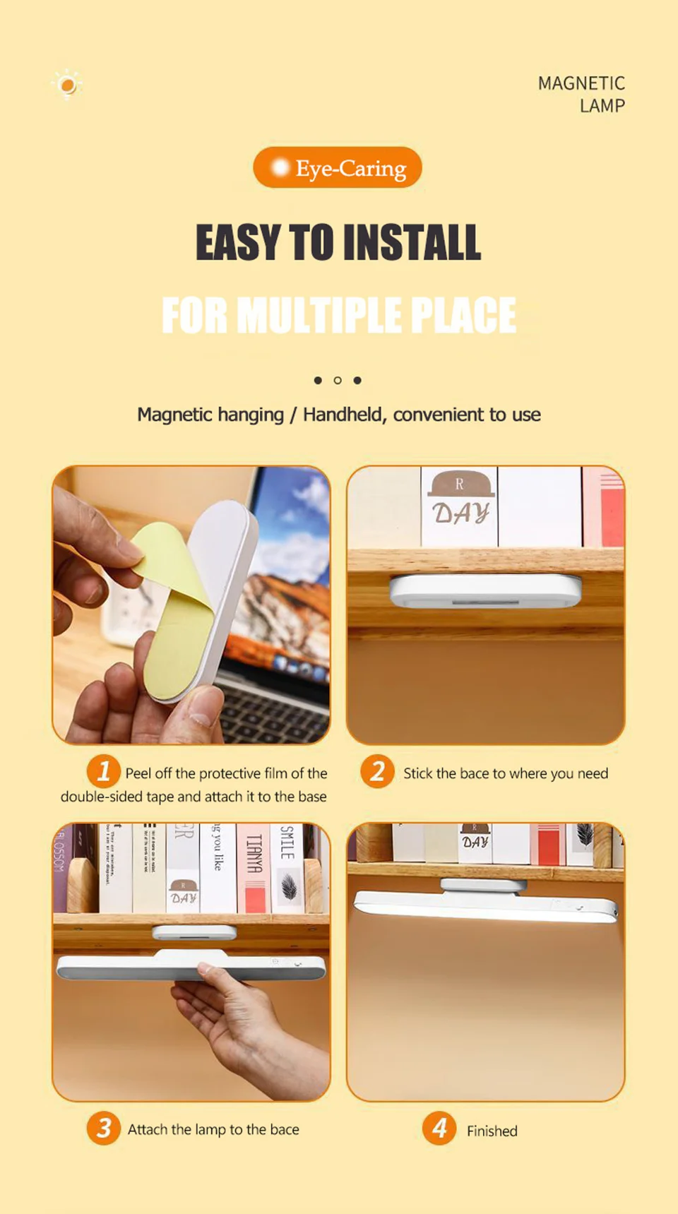 【Fácil de instalar e 120° Ângulo ajustável】Com ímãs integrados e adesivo 3M atualizado, você pode colar o mini suporte magnético da lâmpada sem fio em qualquer lugar e fixar o corpo da luz noturna.Sem fio e portátil, faça o que quiser.A direção da luz pode ser ajustada em até 88 graus para cima ou para baixo para corresponder à sua área de trabalho ou alvo de visualização.