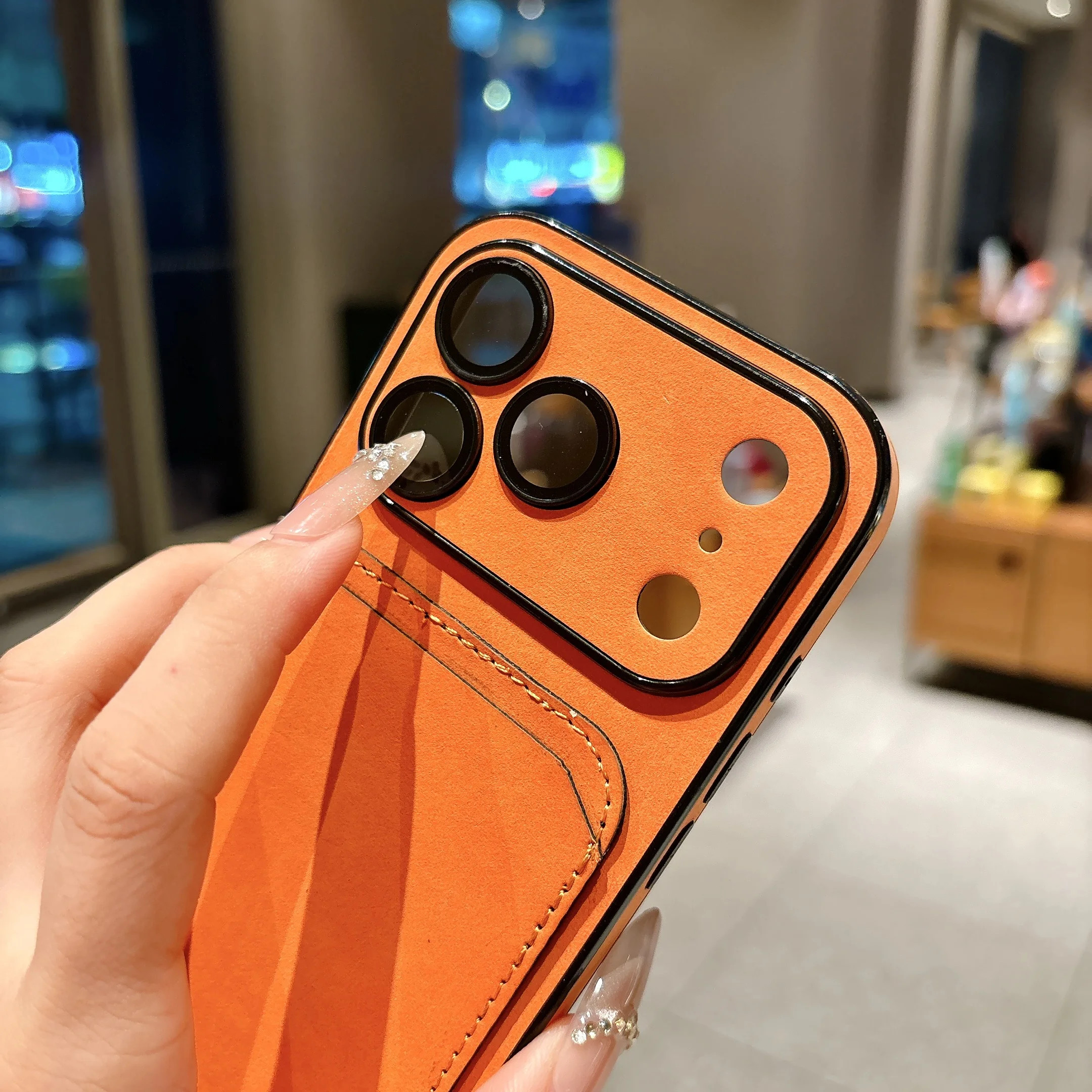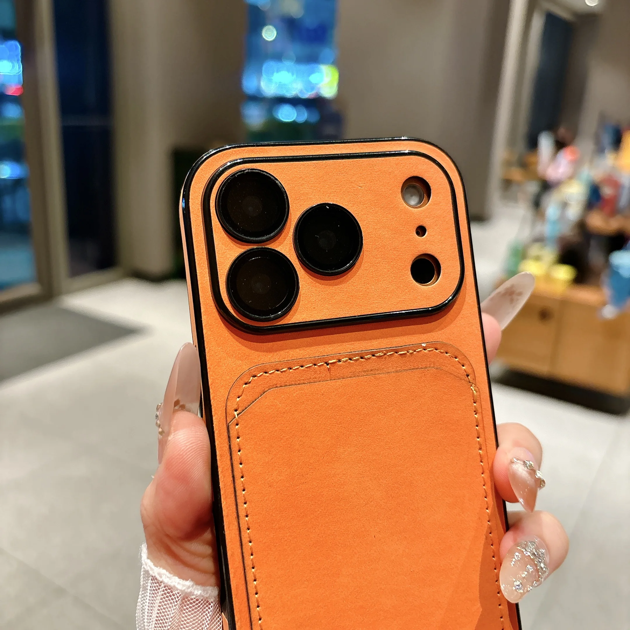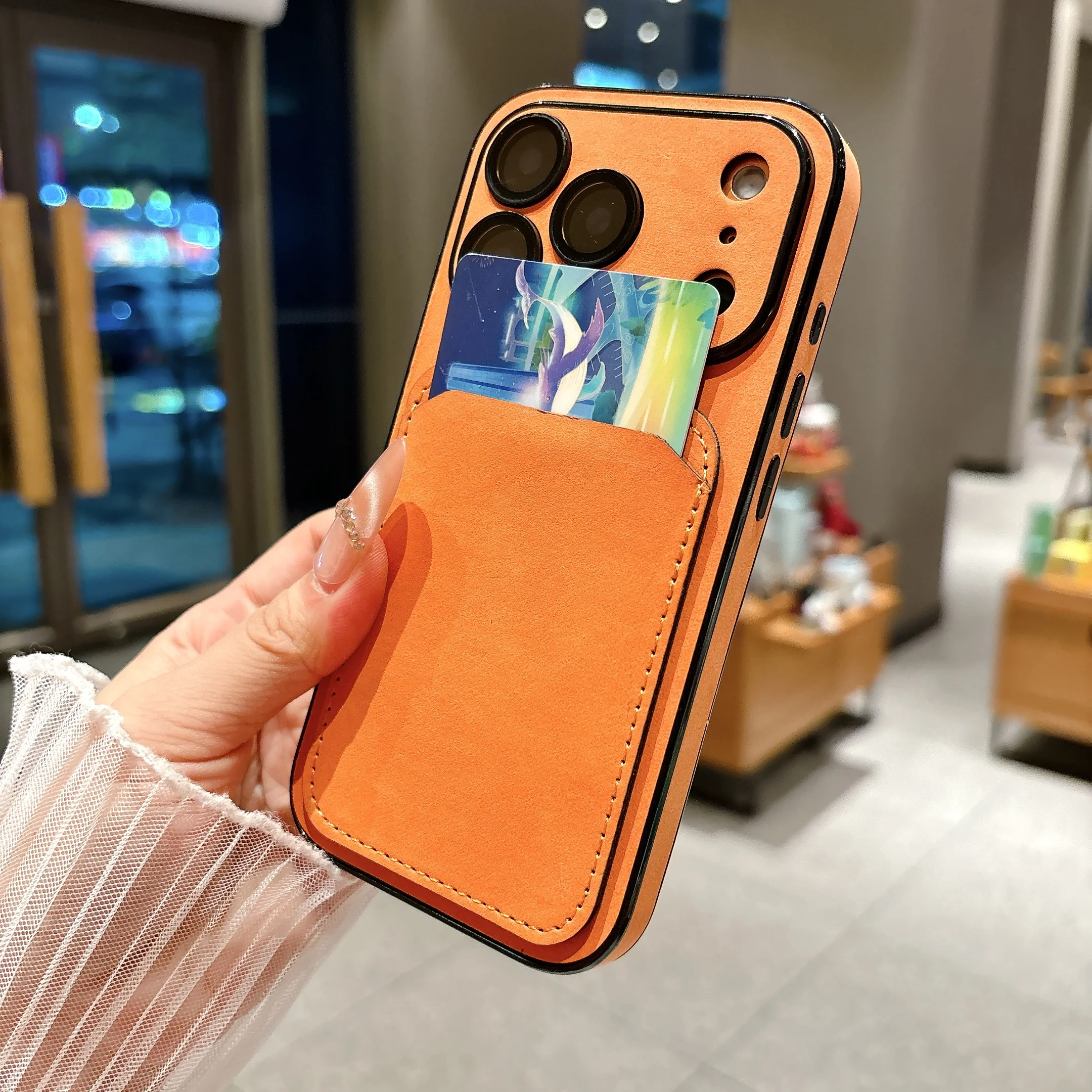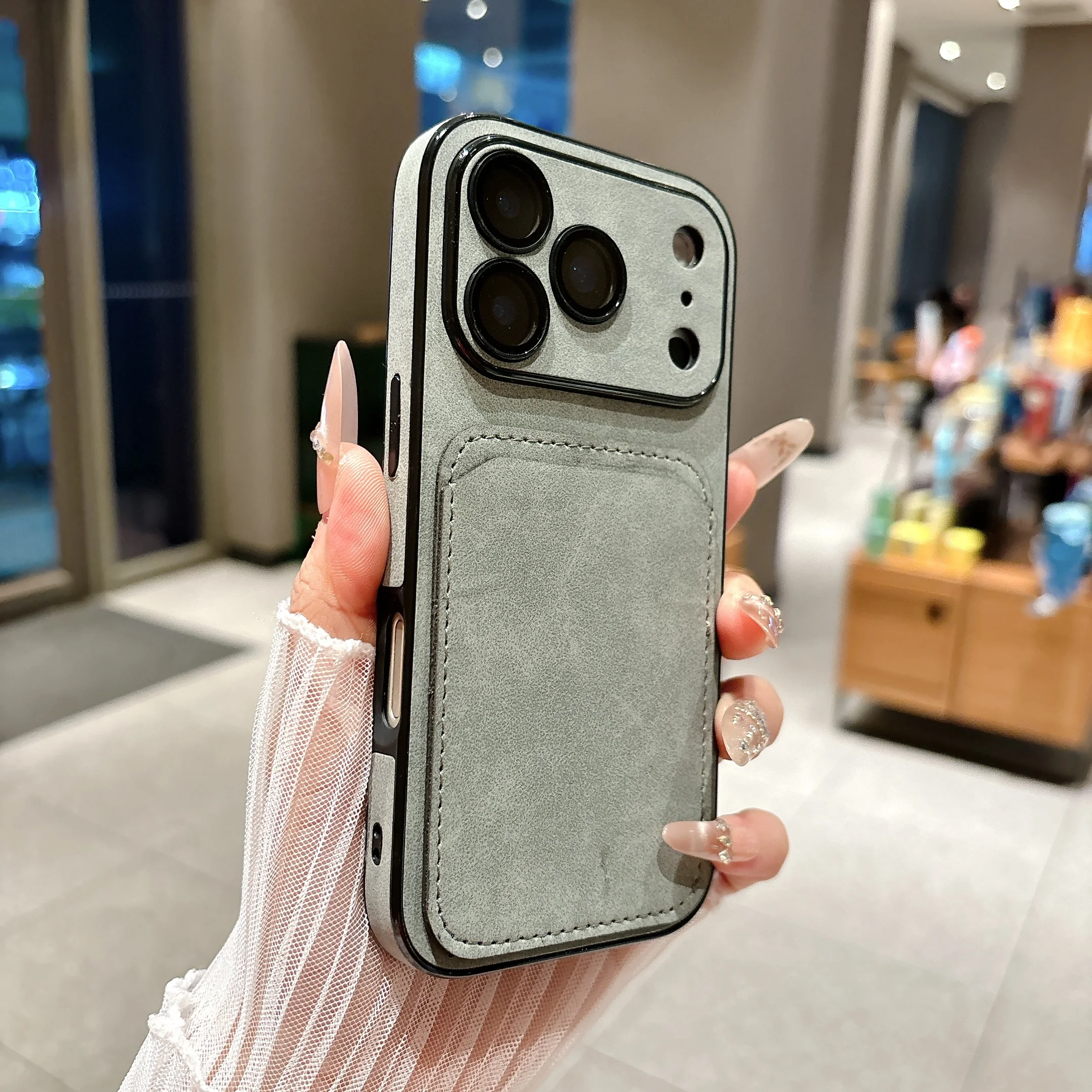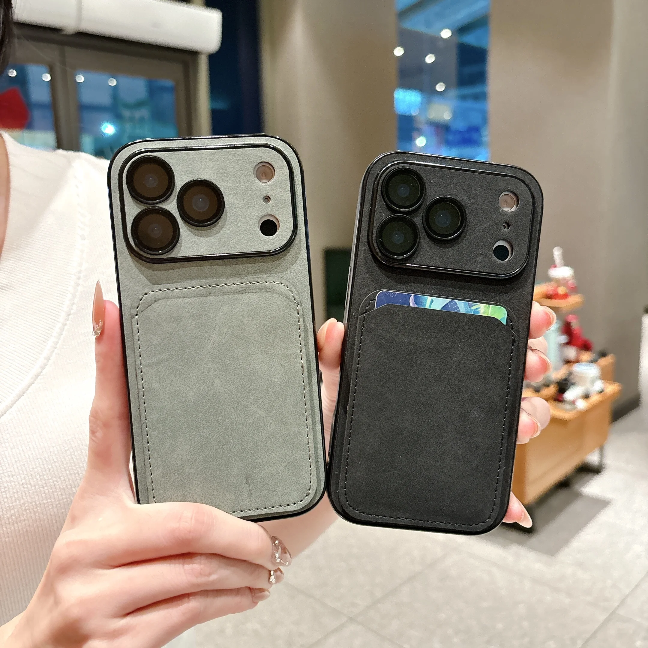 - > Retro camurça couro slot para cartão saco carteira caso de telefone para iphone 17 16 15 14 13 pro max plus instantaneamente virar17 grande janela capa