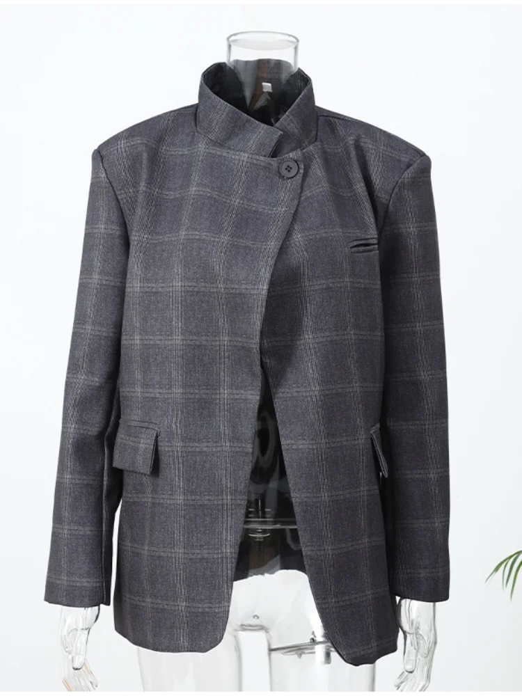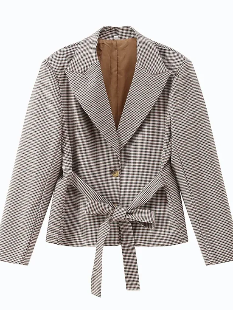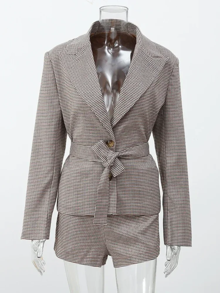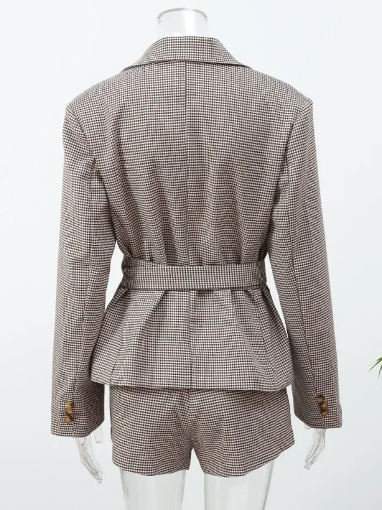 - > Retro verificado cinto jaqueta shorts conjunto moda feminina manga cheia lapela botões bolsos blazer terno 2025 novas roupas de rua commute