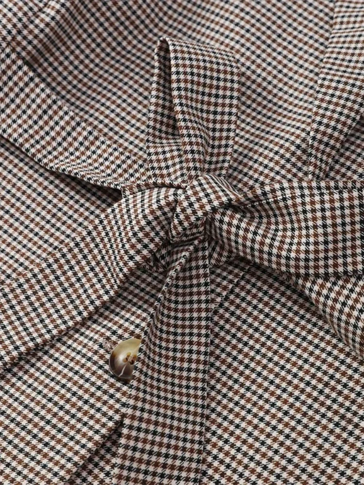 Com um padrão xadrez retrô e gola em V, este conjunto transita facilmente do escritório para passeios casuais.