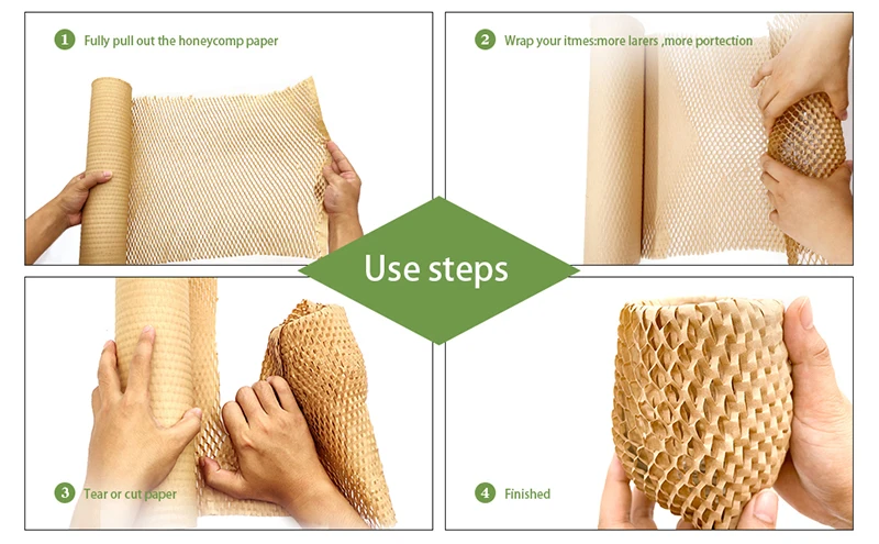 Reciclável: Este rolo de papel favo de mel é degradável e reciclável.É um substituto para outros materiais de enchimento, como sacos plásticos de bolhas.Após o alongamento, a estrutura em favo de mel pode aumentar o desempenho de amortecimento e proteger eficazmente os itens que precisam ser embrulhados.