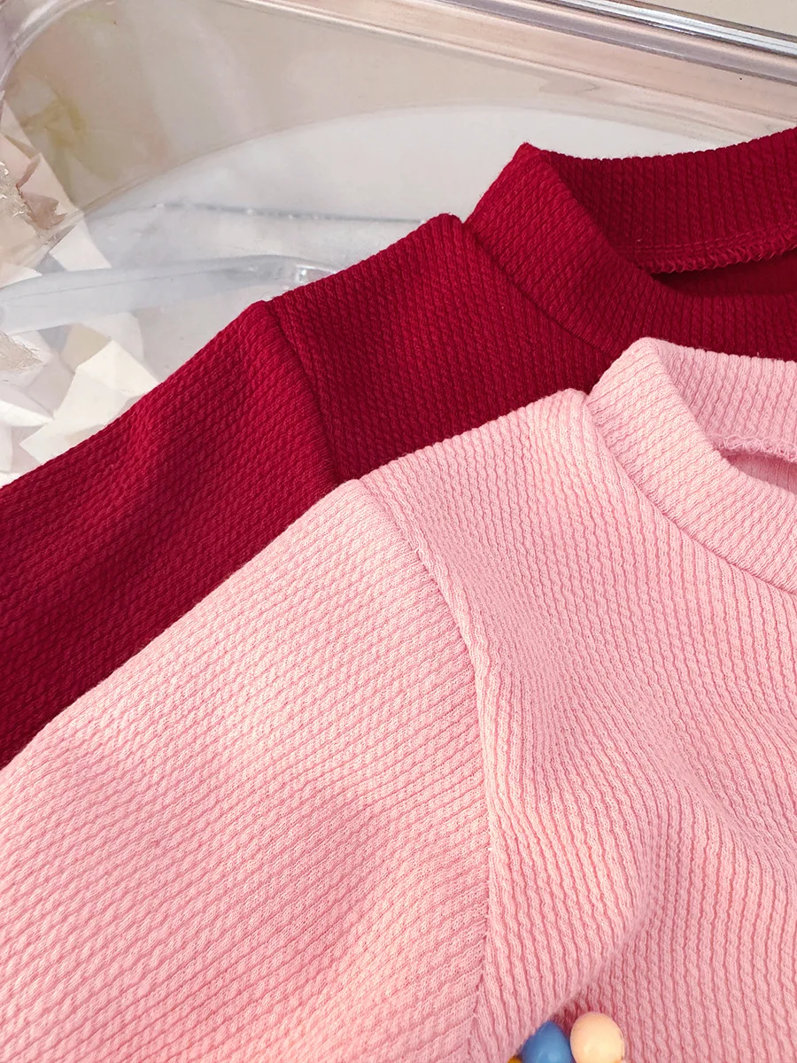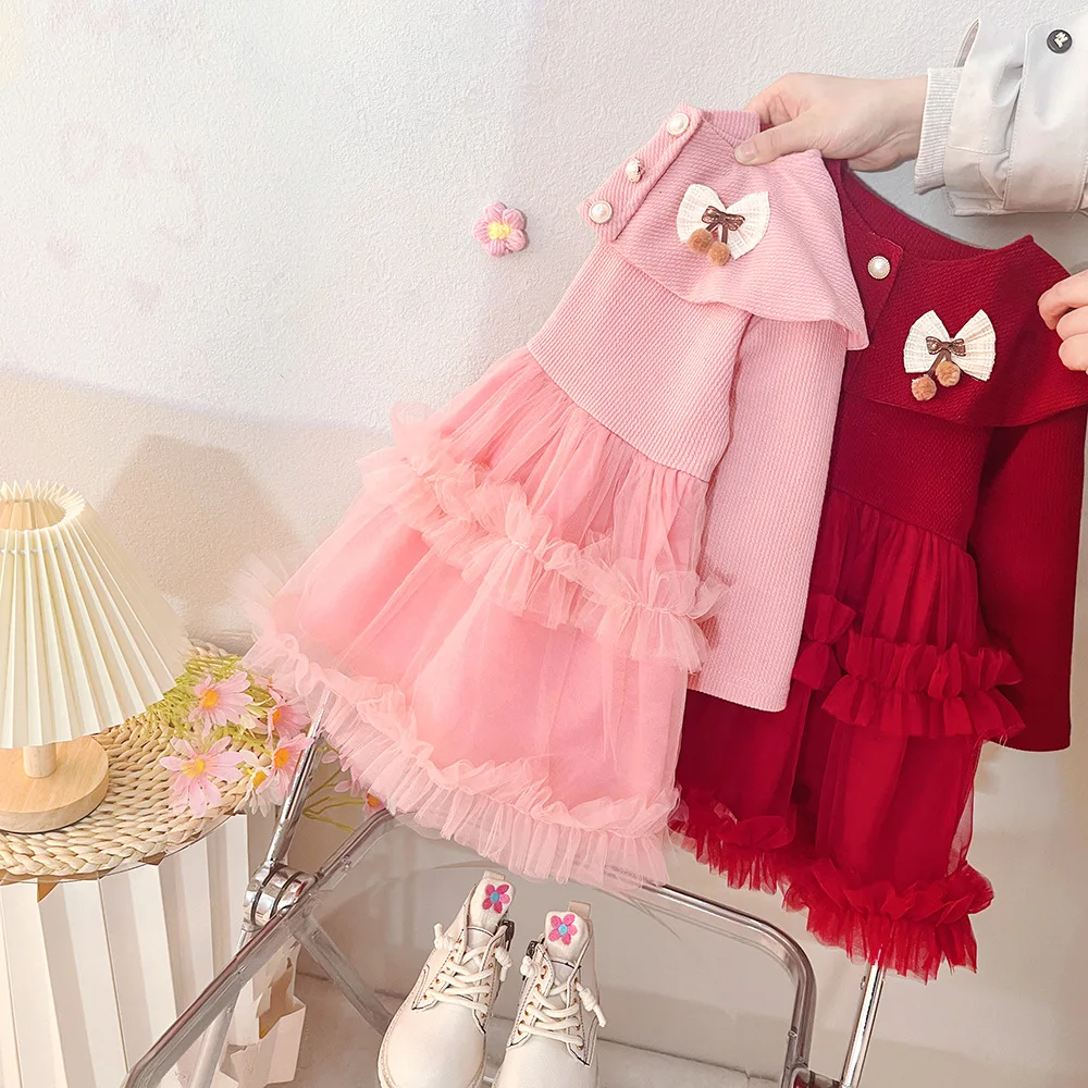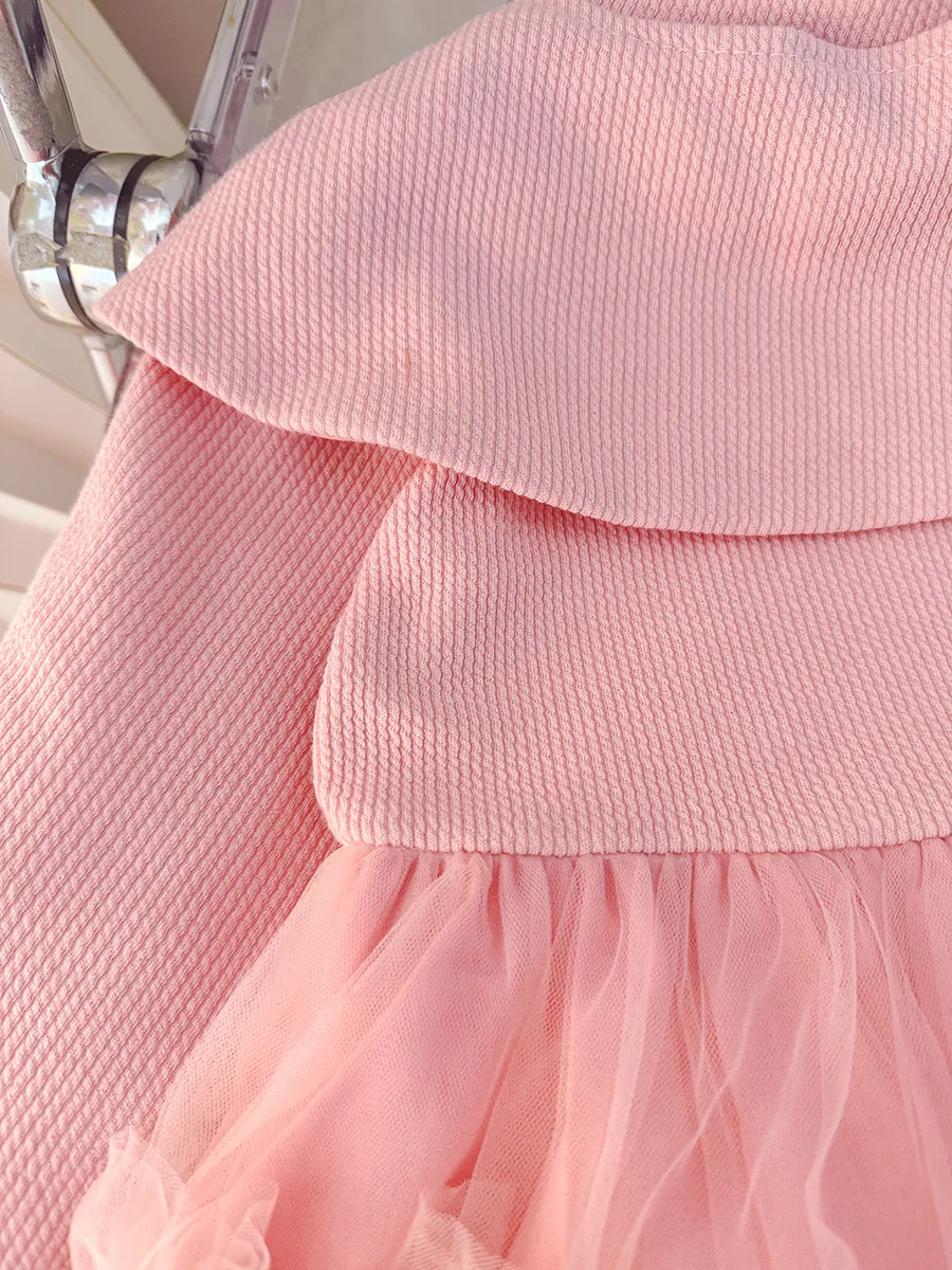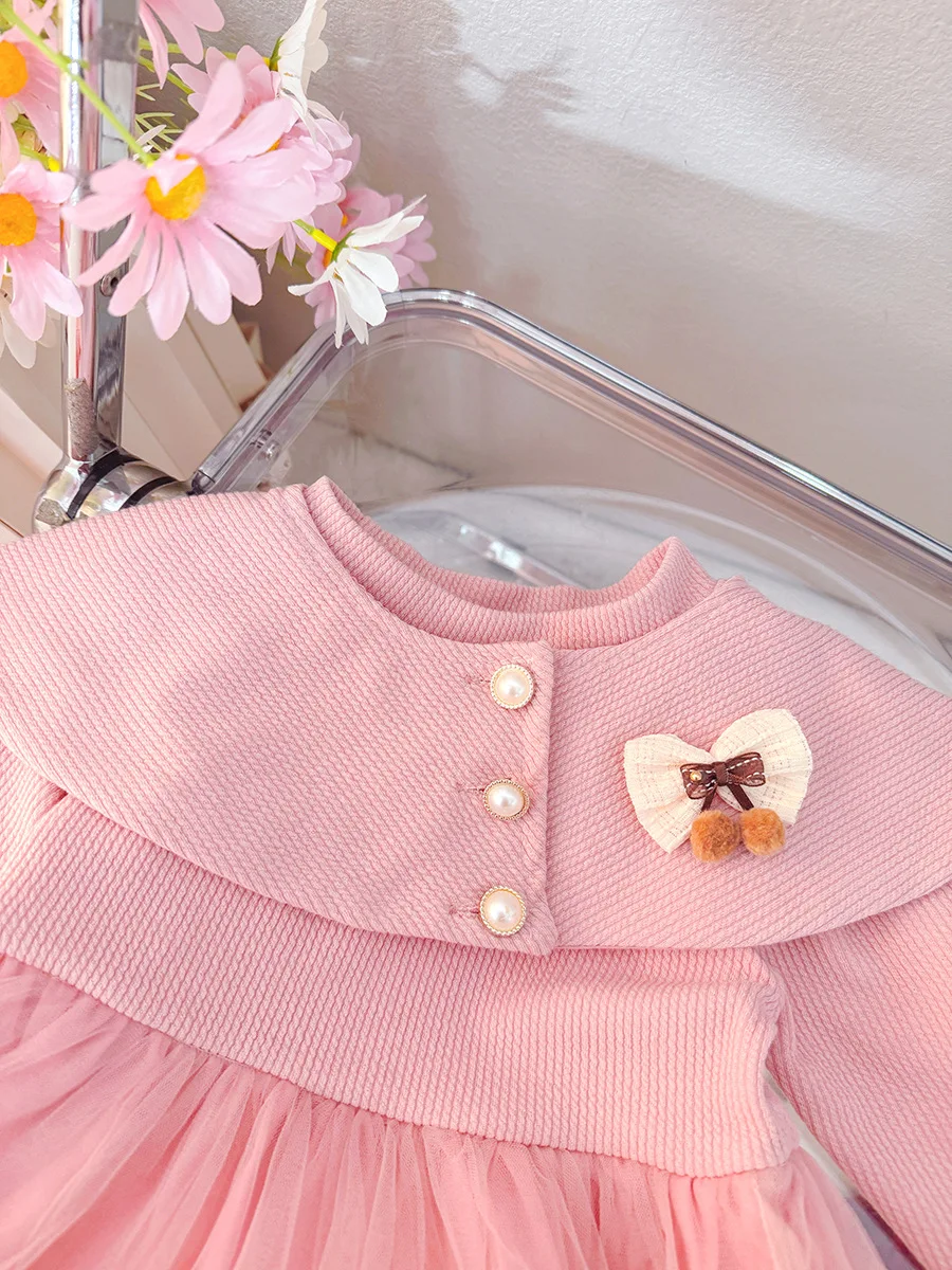 - > Roupas de bebê menina primavera e outono arco boneca colarinho cor sólida malha fofo vestidos de bebê bonito casual menina vestido infantil