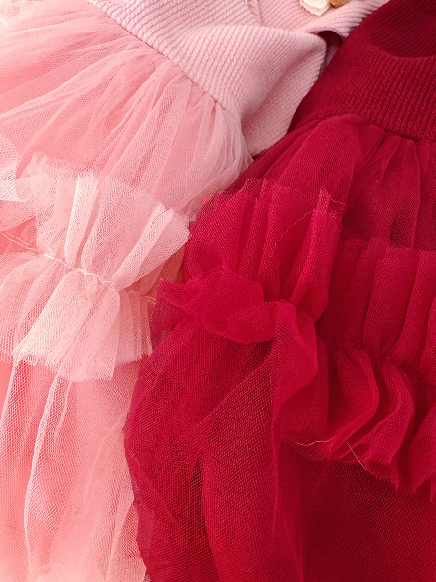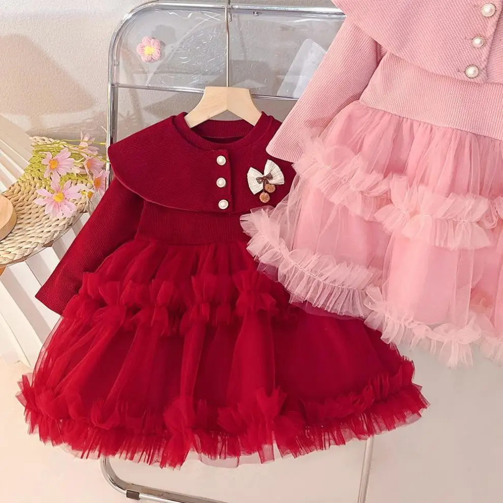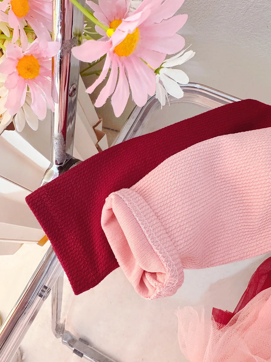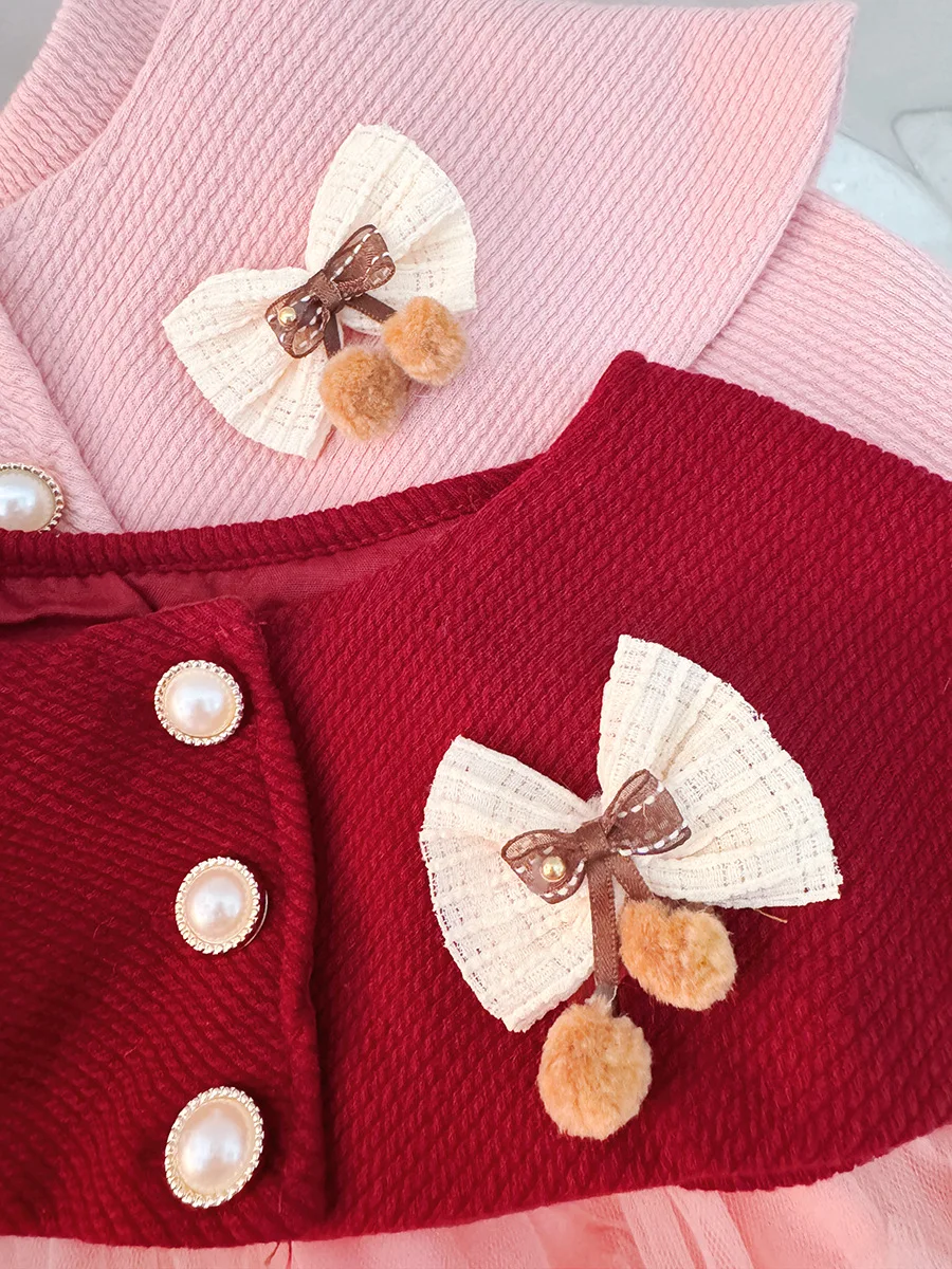 - > Roupas de bebê menina primavera e outono arco boneca colarinho cor sólida malha fofo vestidos de bebê bonito casual menina vestido infantil