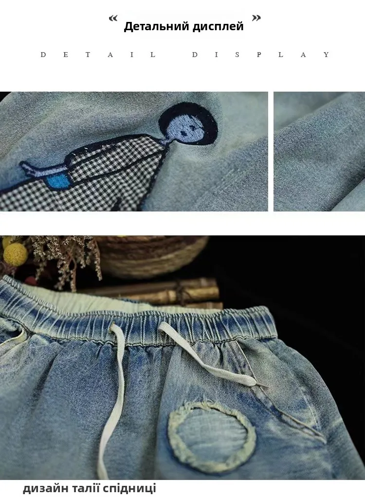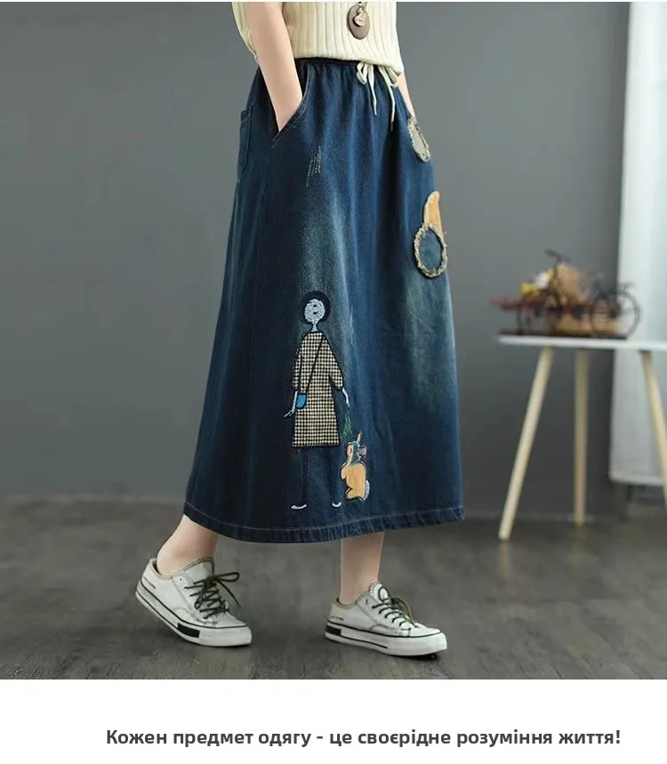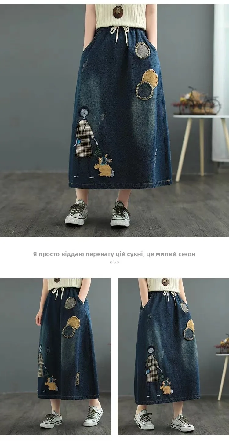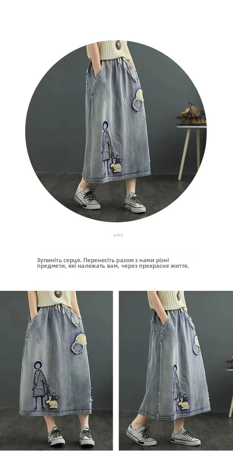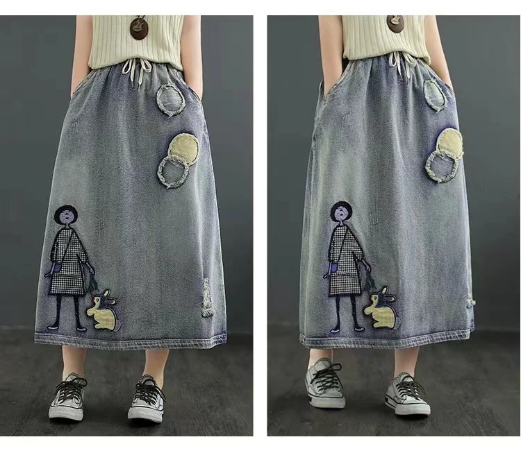 Saia Midi de Jeans com Bordado de Menina em Estilo Cartoon, Cintura Elástica, Efeito Desgastado, Moda Fena