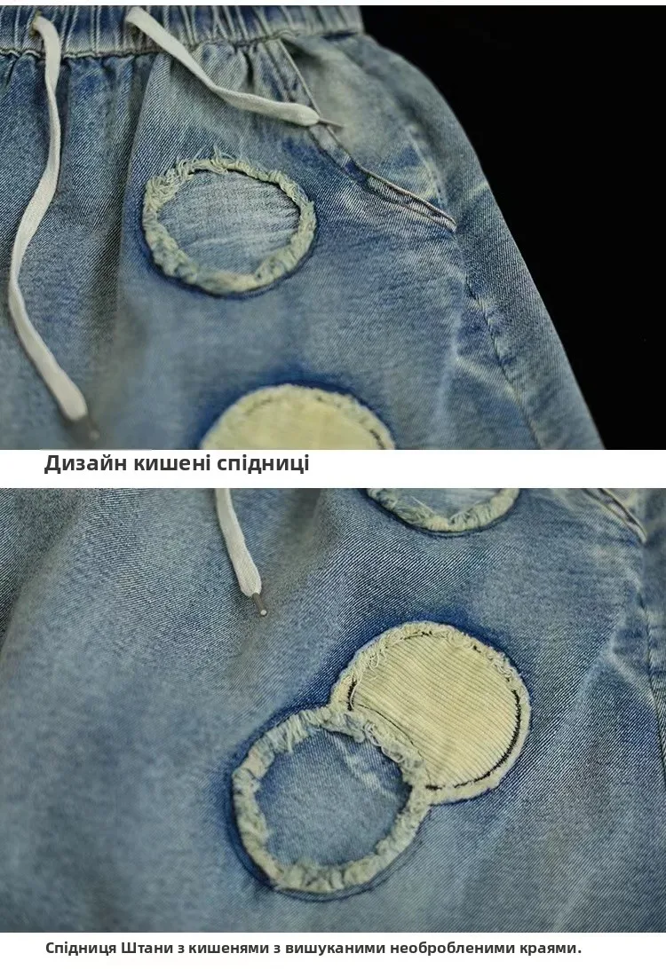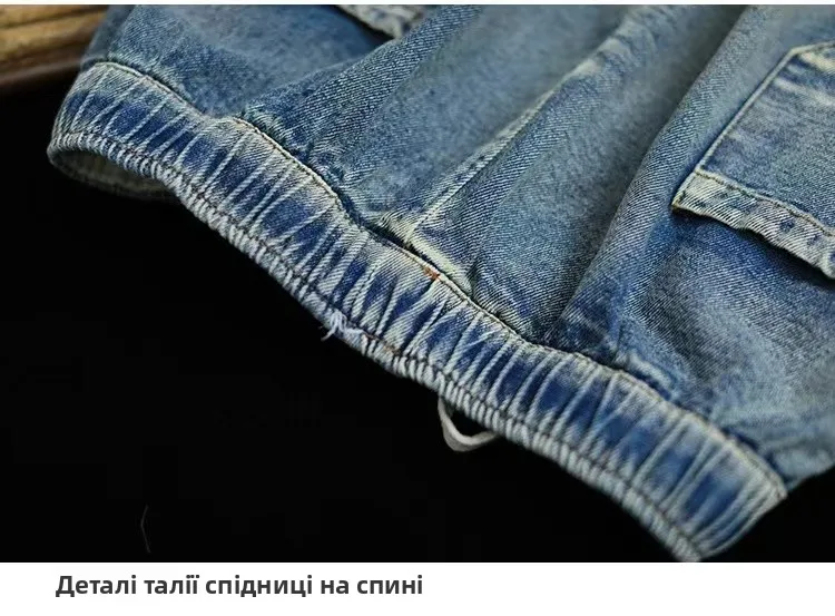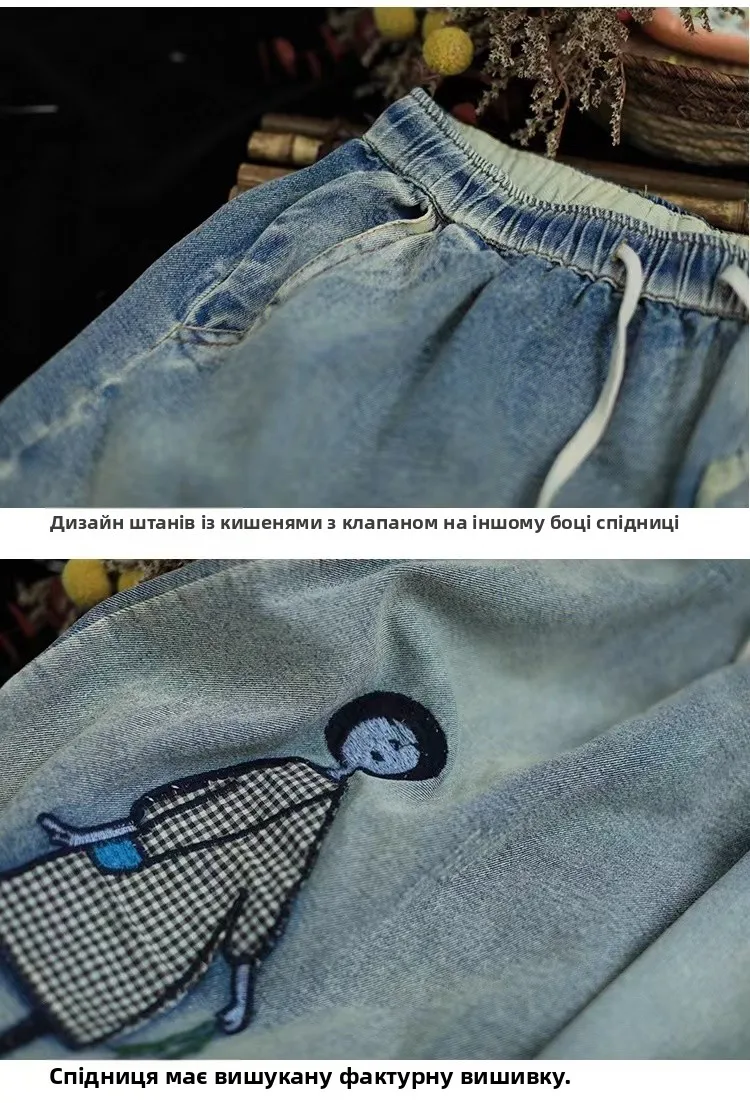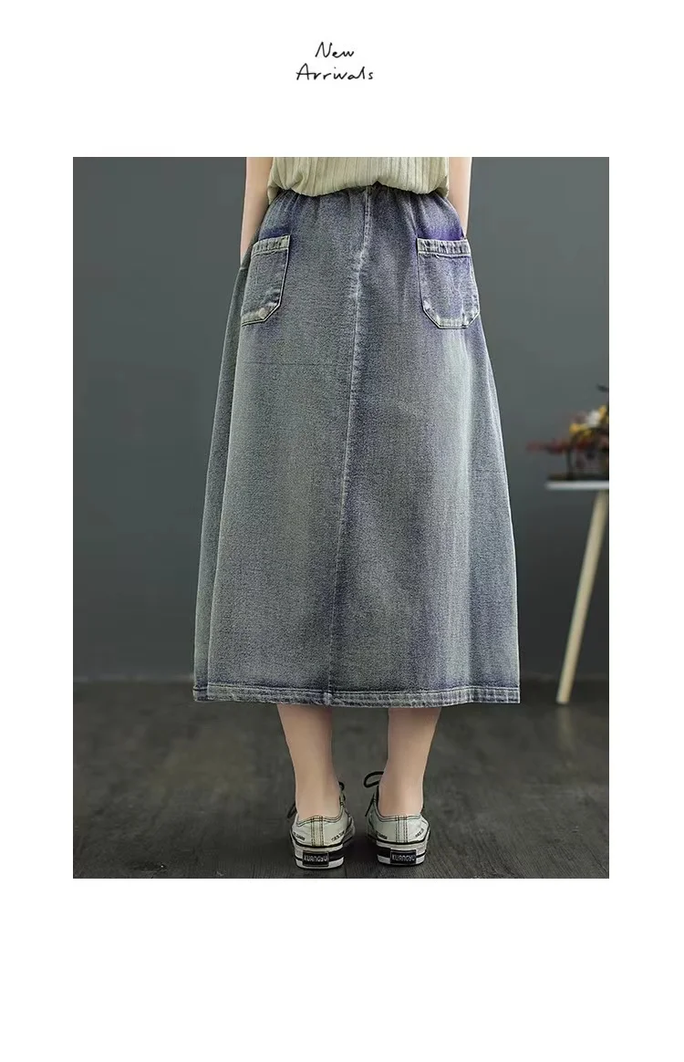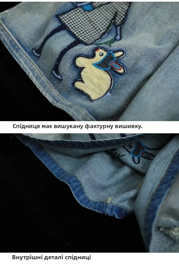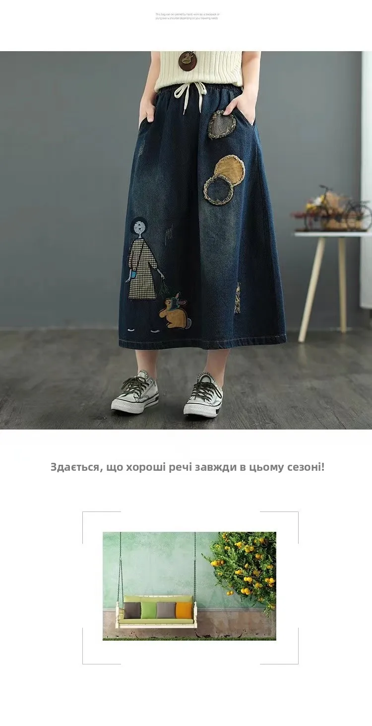 Saia Midi de Jeans com Bordado de Menina em Estilo Cartoon, Cintura Elástica, Efeito Desgastado, Moda Fena