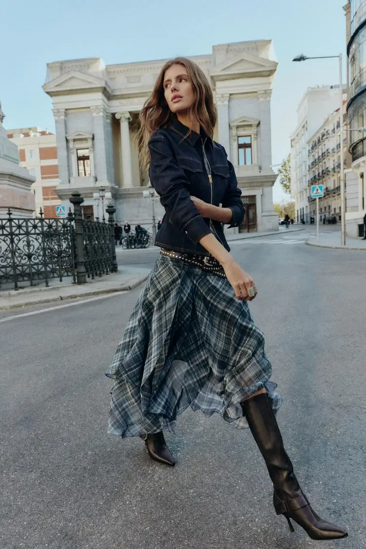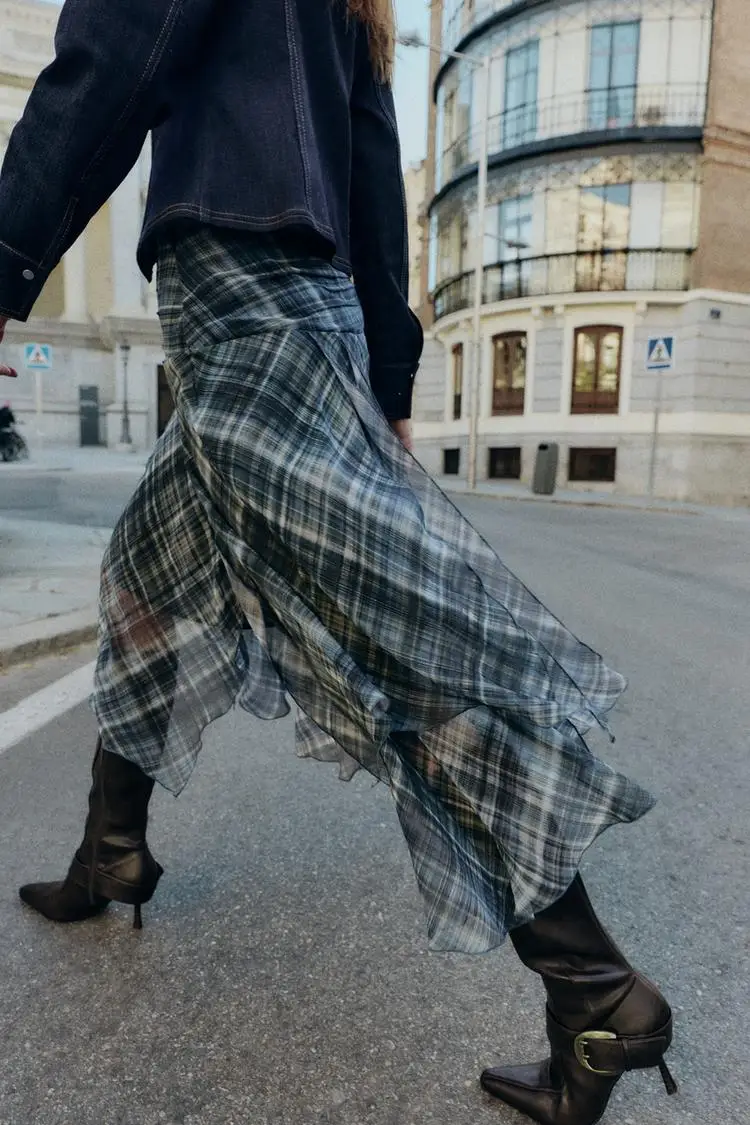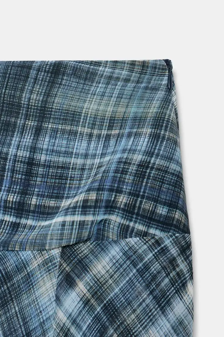 Saia Midi Xadrez de Cintura Alta com Bainha Assimétrica Fena - Nova Moda de Inverno Estilo Casual Psada para o Dia a D...
