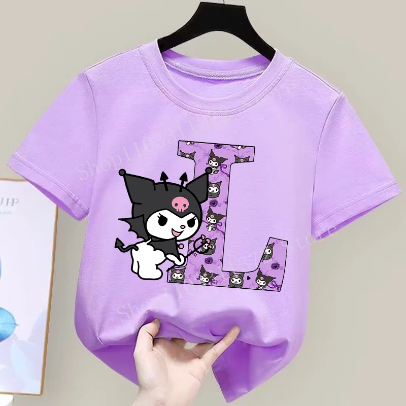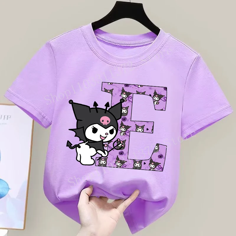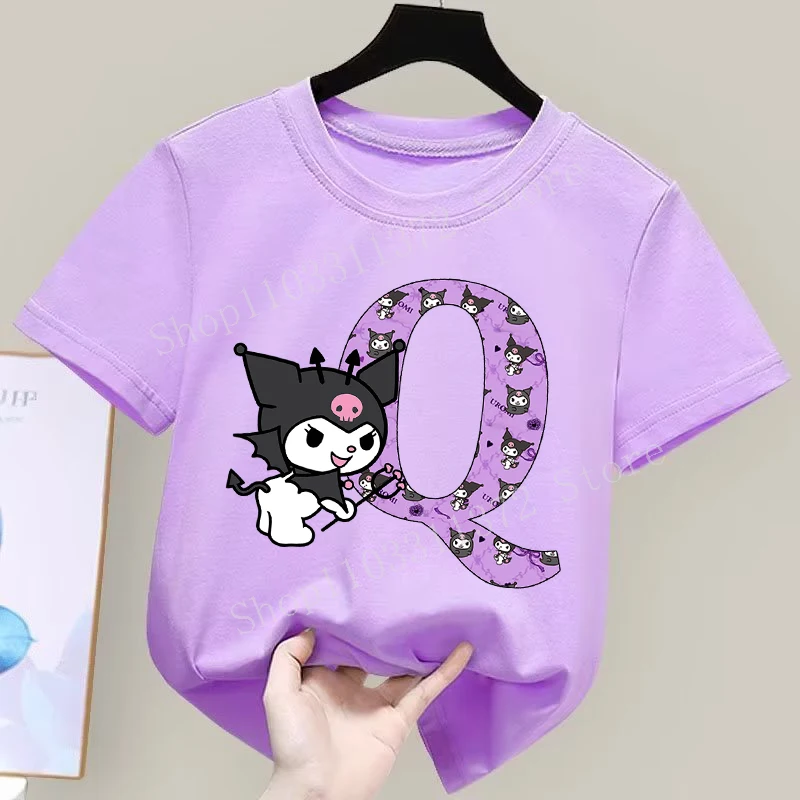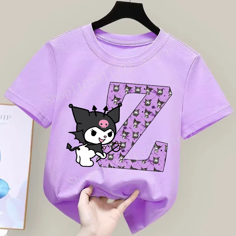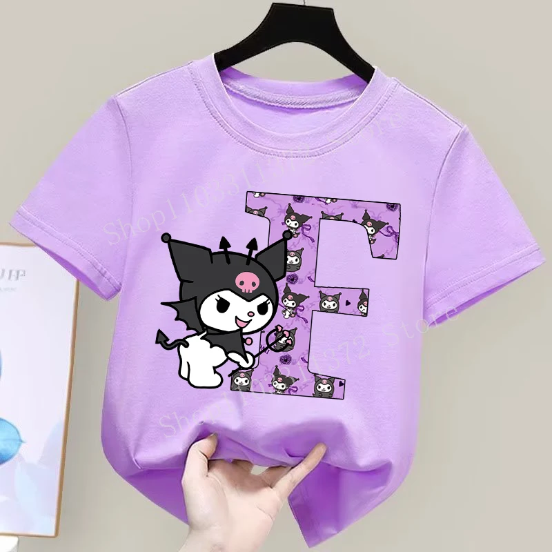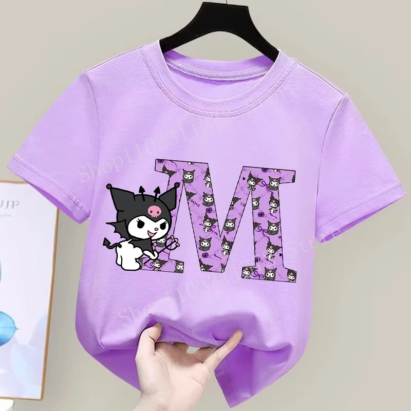 - > Sanrio kuromi camiseta infantil fofa de desenho animado anime carta A-Z estampa roupas de meninas moda infantil algodão manga curta tops