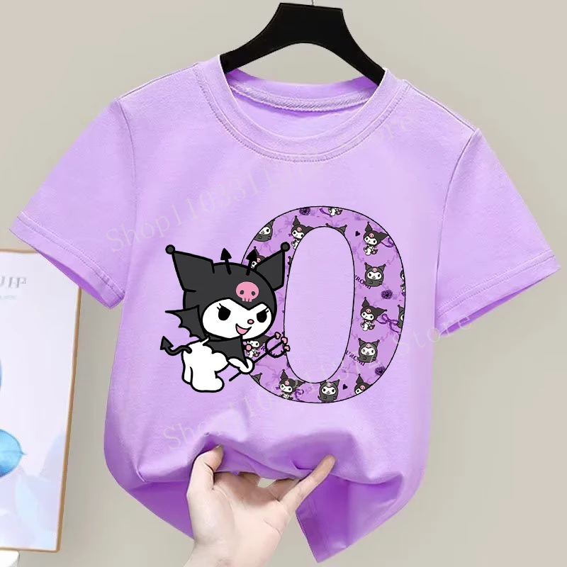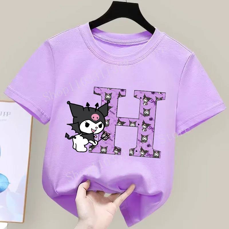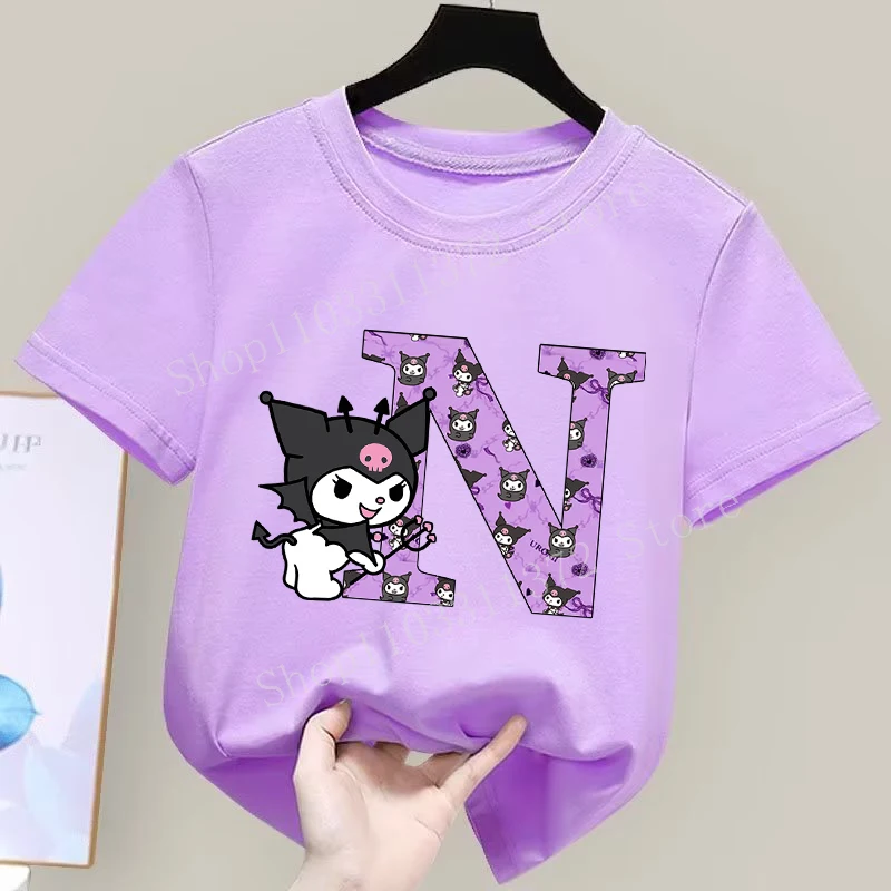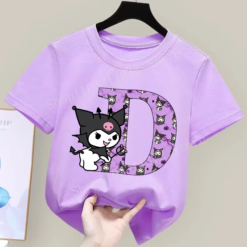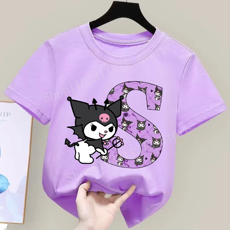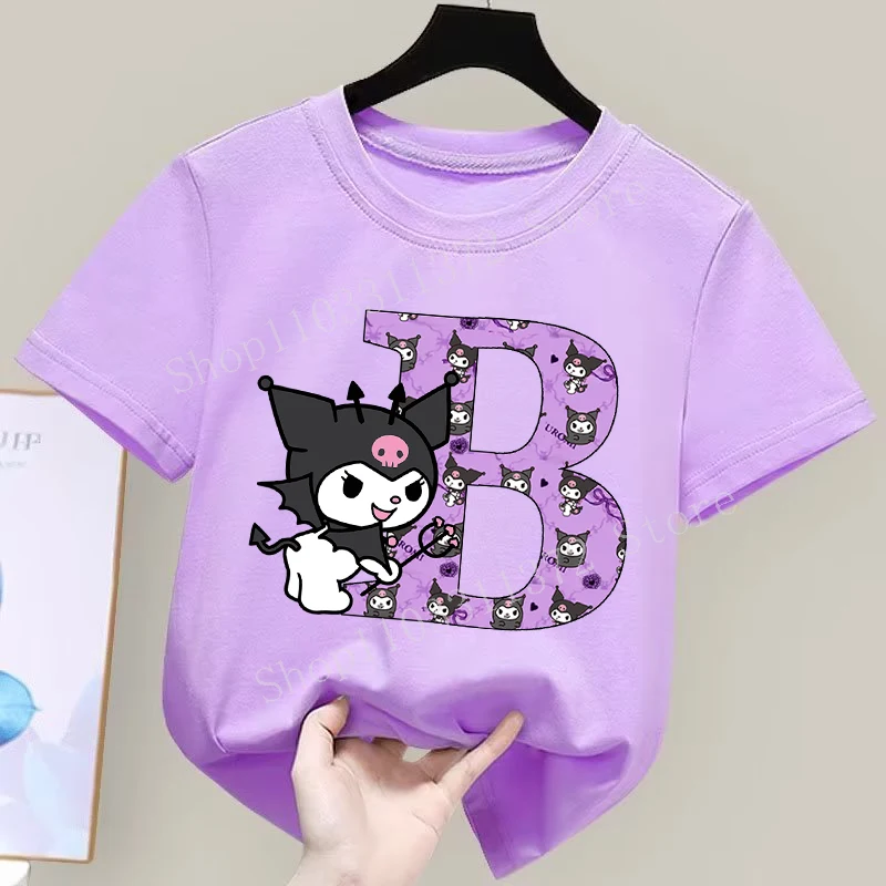 - > Sanrio kuromi camiseta infantil fofa de desenho animado anime carta A-Z estampa roupas de meninas moda infantil algodão manga curta tops