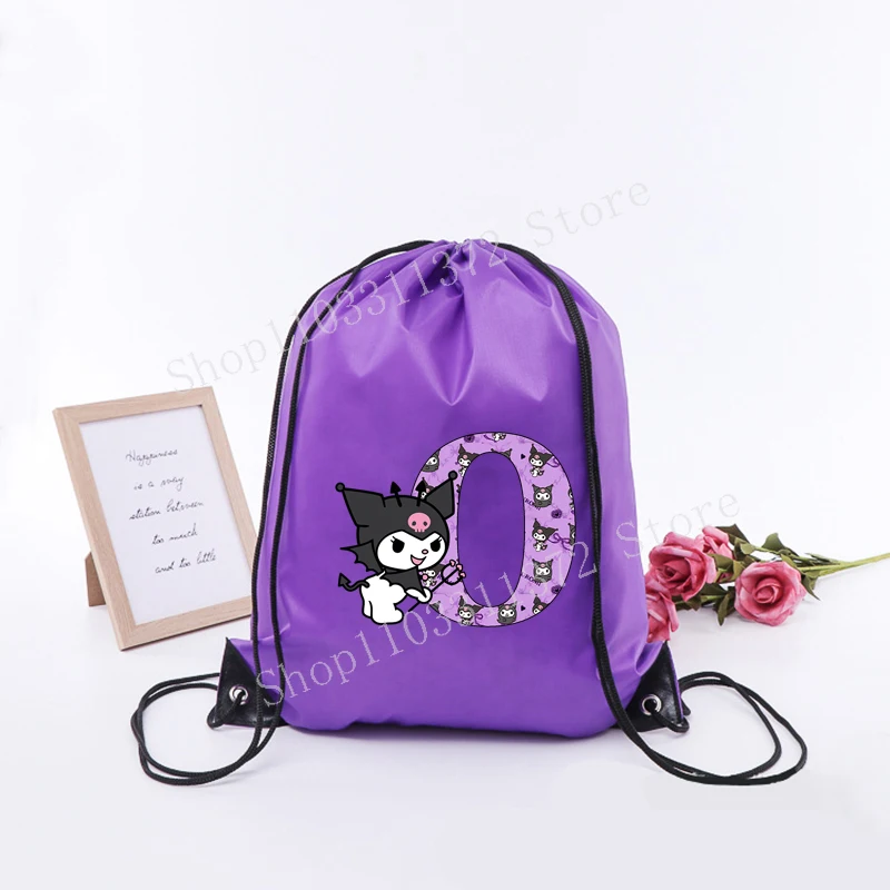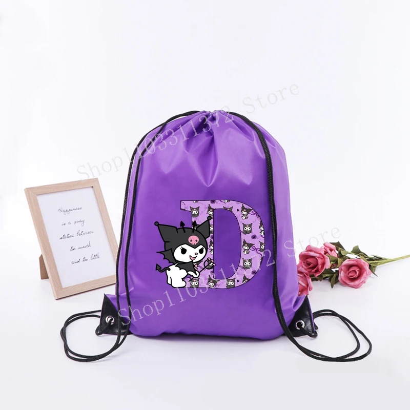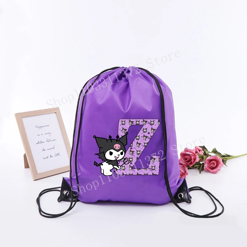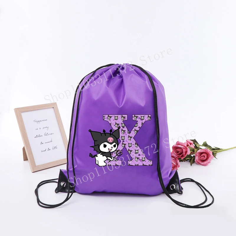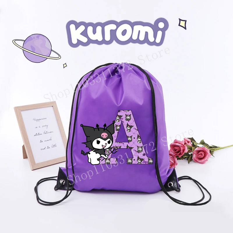 - > Sanrio kuromi saco de cordão moda carta A-Z mochila leve grande capacidade bonito dos desenhos animados anime meninas adulto ginásio bolsas