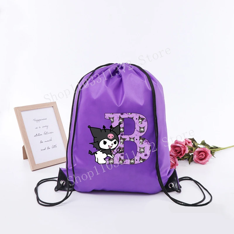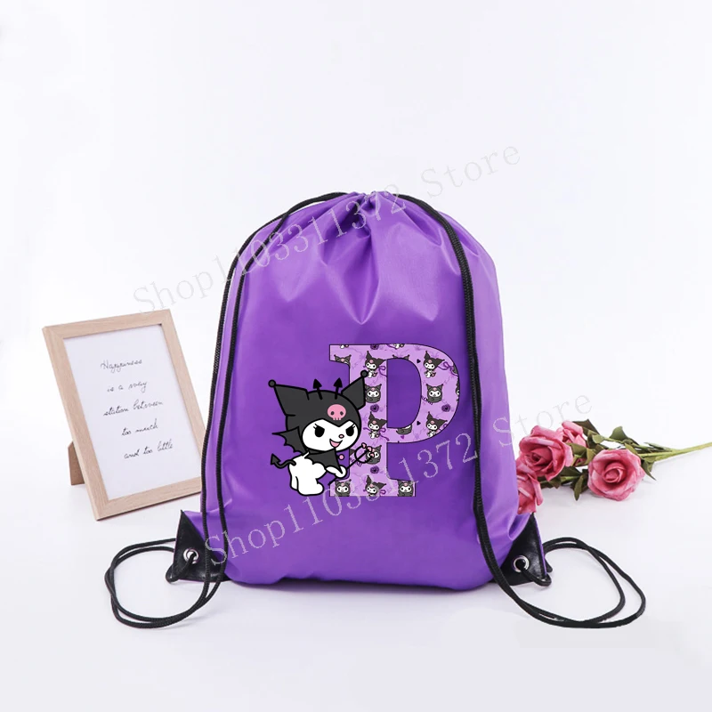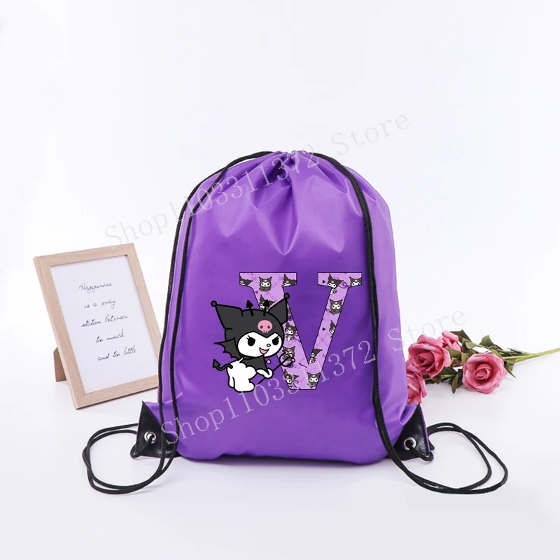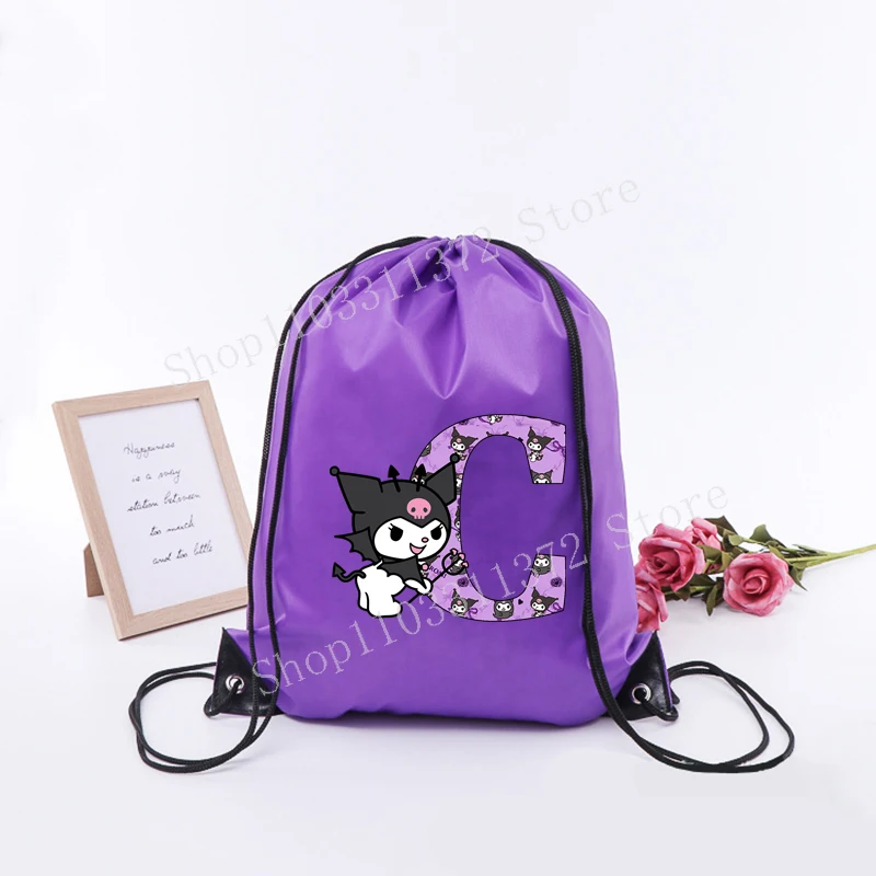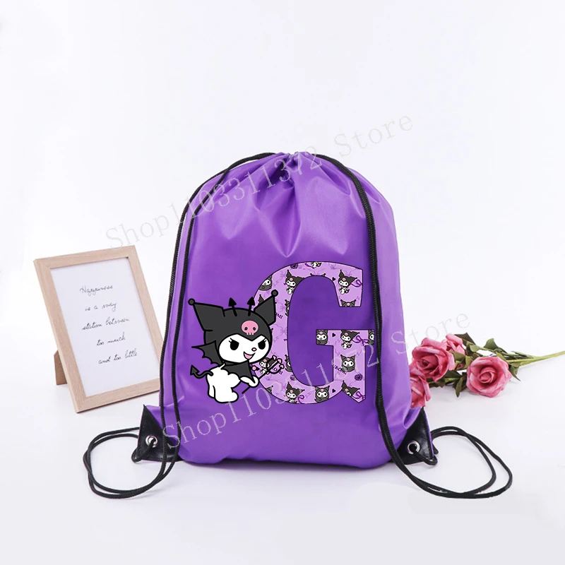 - > Sanrio kuromi saco de cordão moda carta A-Z mochila leve grande capacidade bonito dos desenhos animados anime meninas adulto ginásio bolsas