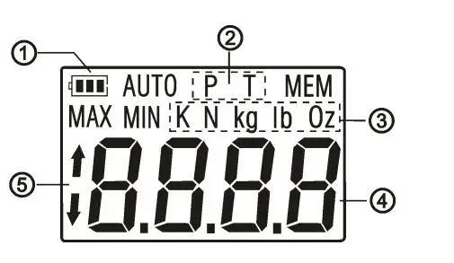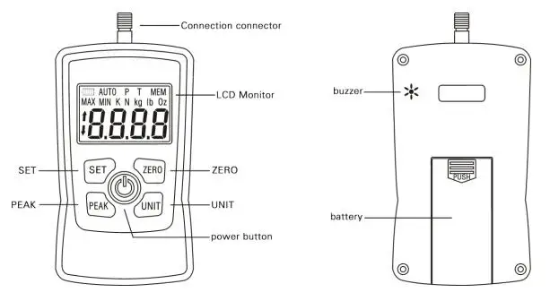 2.A tela exibe simultaneamente "P" e "T" como o modo de pico inicial, indicando que o primeiro valor de pico medido dentro de um período de tempo é registrado.A tela exibe um único "P" como o modo de pico, indicando que o período de tempo medido é registrado com o valor máximo de força.Pressione a tecla "PEAK" para alternar livremente entre o modo pico e o modo primeiro pico.