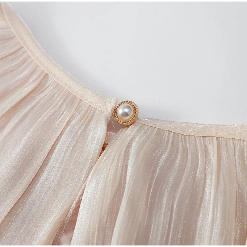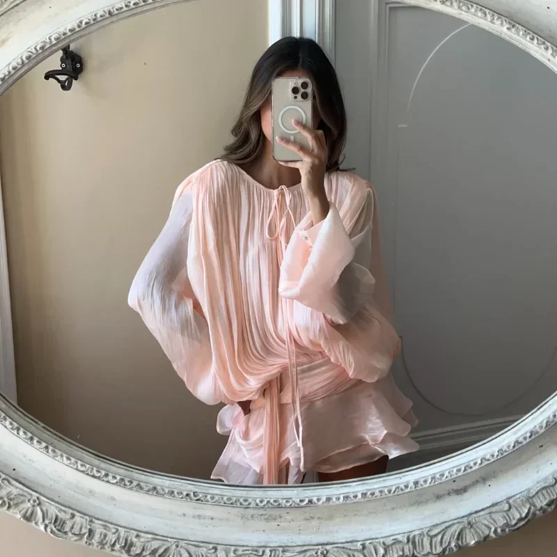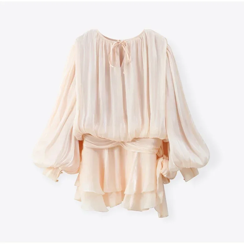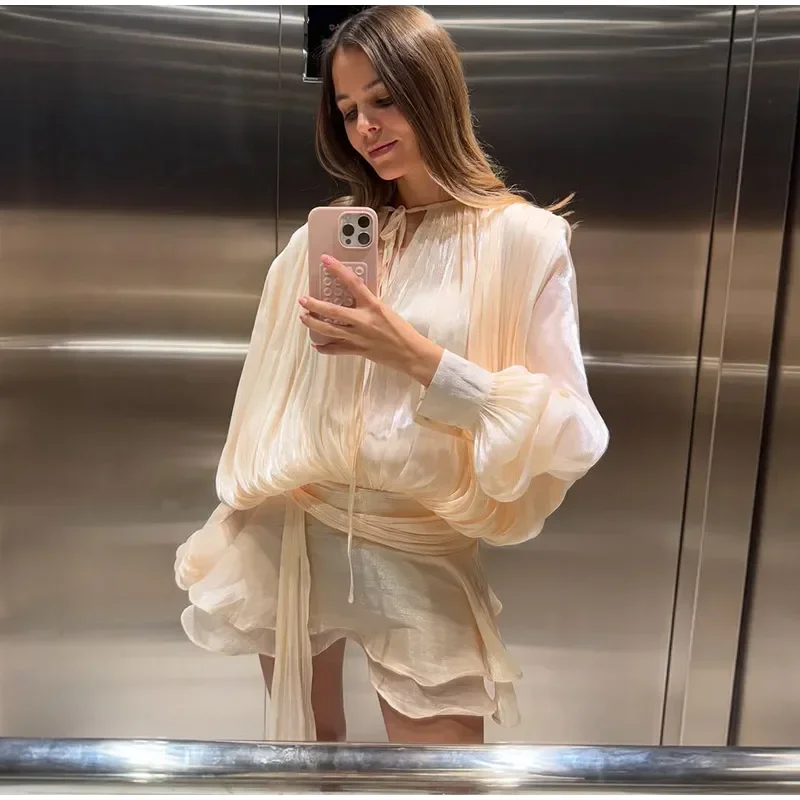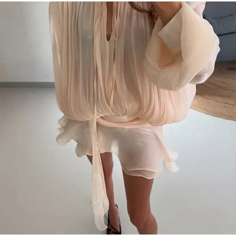 Shinny gaze sólida em camadas babados uma linha mini vestidos femininos elegante o pescoço lanterna mangas compridas vestidos chiques senhora vestidos de festa