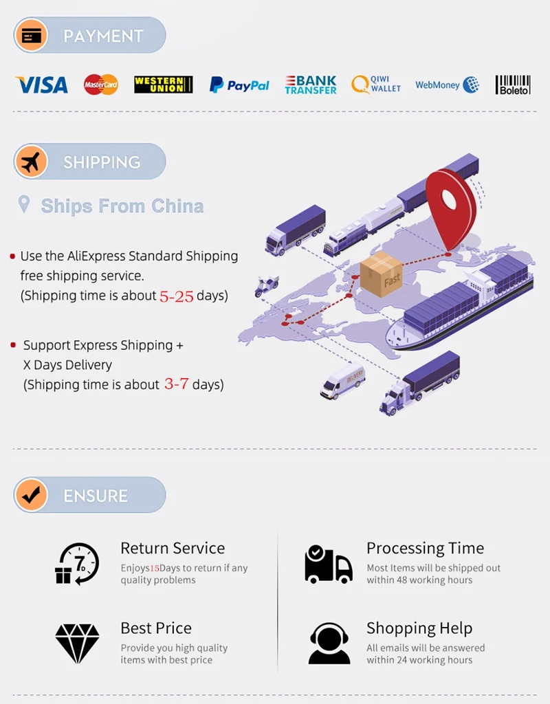 De modo geral, após efetuar o pagamento, nossos produtos podem ser enviados dentro de 1-48 horas ou até mais rápido. Se você tiver algum requisito de personalização, entre em contato com nosso atendimento ao cliente online a tempo antes de fazer o pedido