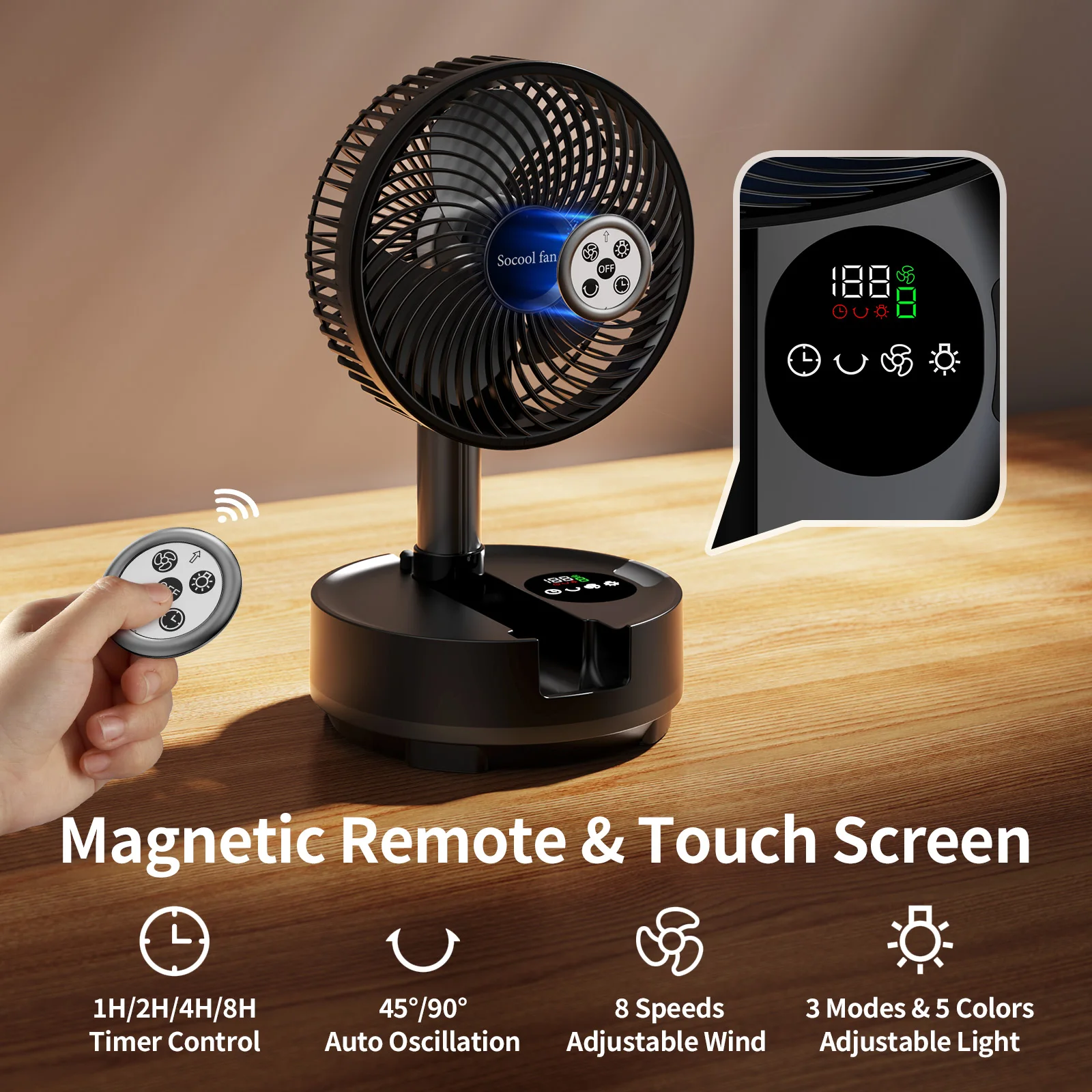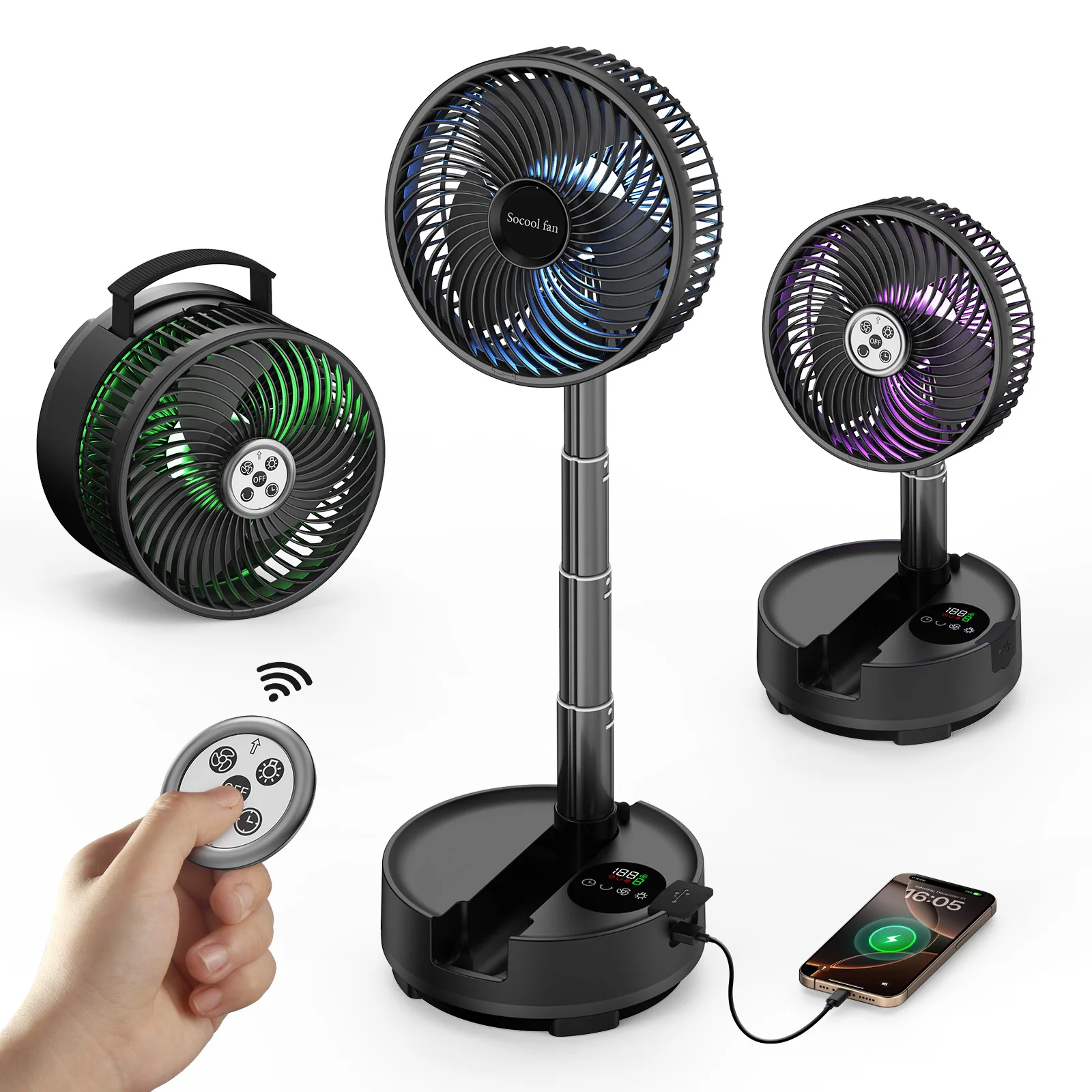- > Socool Ventilador Portátil Dobrável 20000mAh 8 Velocidades & Oscilação Automática Ventilador de Mesa e Pé Recarregável com Controle Remoto para Casa