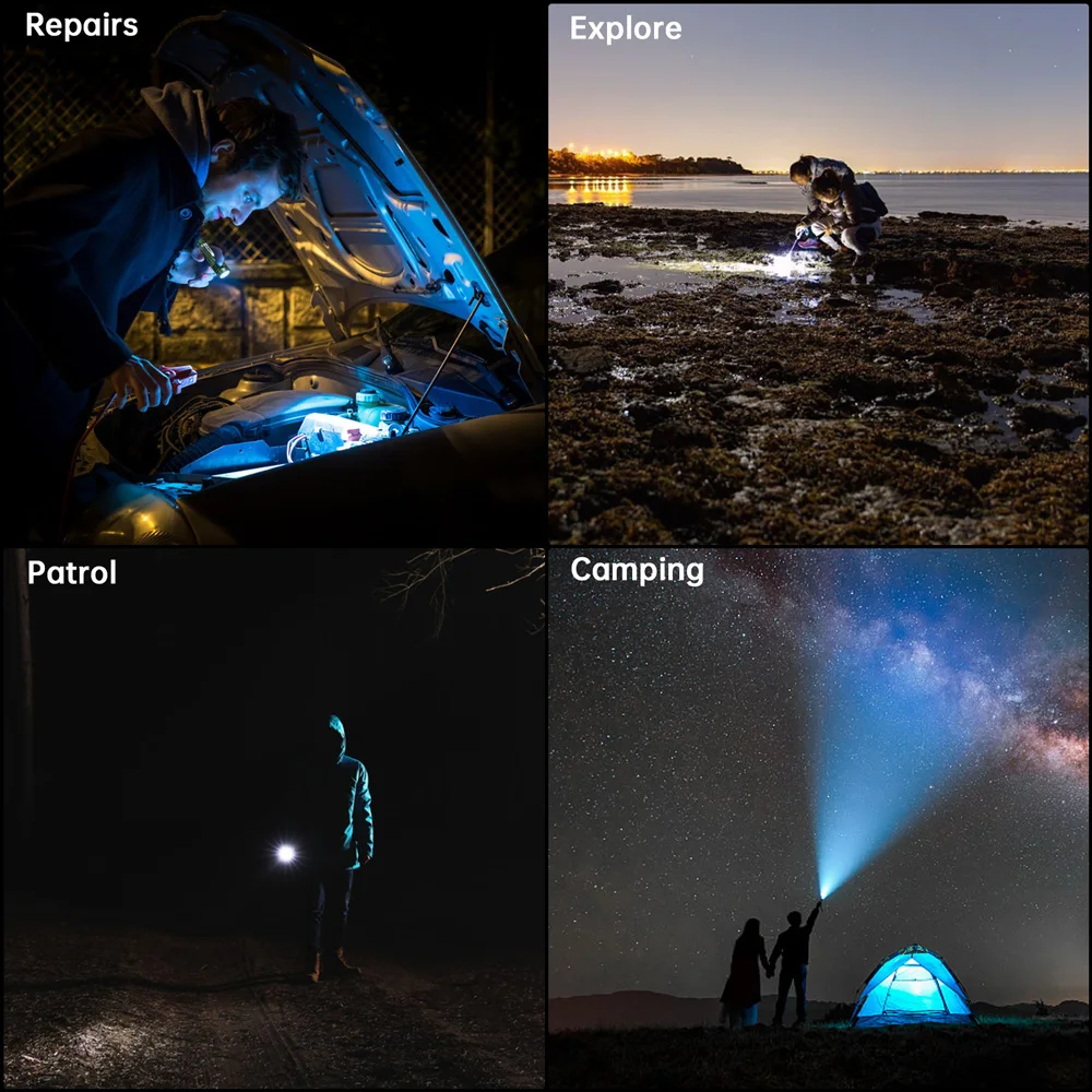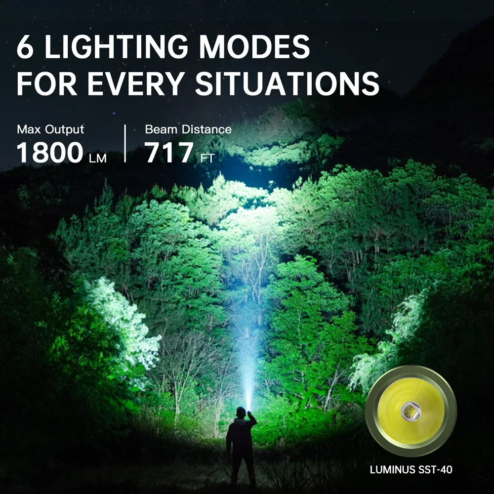 1.Desempenho líder: Esta lanterna LED está equipada com SST-40, iluminando facilmente o caminho à sua frente com um alcance significativamente melhorado: oferece uma saída máxima de 1800lm a uma distância de até 217 metros, produzindo um feixe particularmente macio e equilibrado perfil para preservar uma visão confortável.