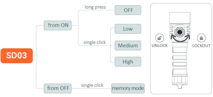 11. Aviso de baixa tensão: O SD06 cai automaticamente para um nível de brilho mais baixo quando a tensão da bateria é inferior a 3,0 V. Quando cai para o modo Baixo, a luz principal pisca duas vezes por minuto, indicando que a carga restante da bateria é fraca. Por favor, substitua-o a tempo!