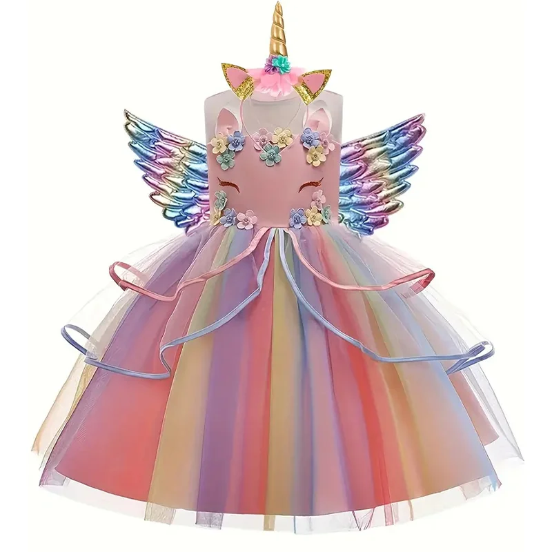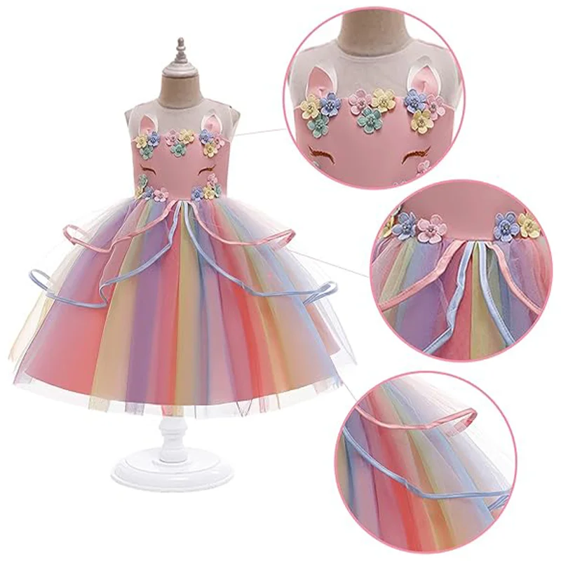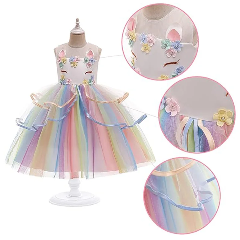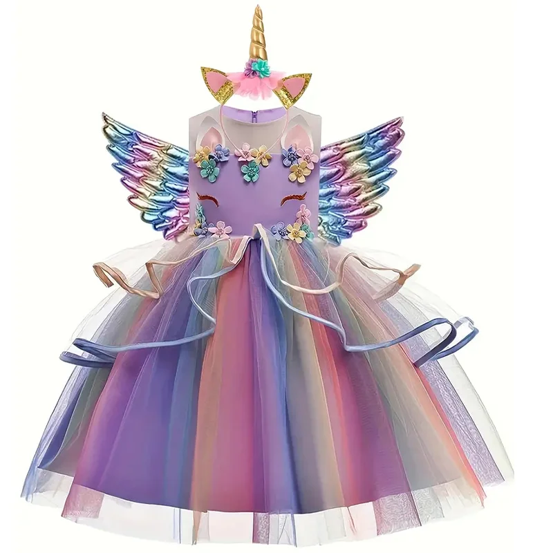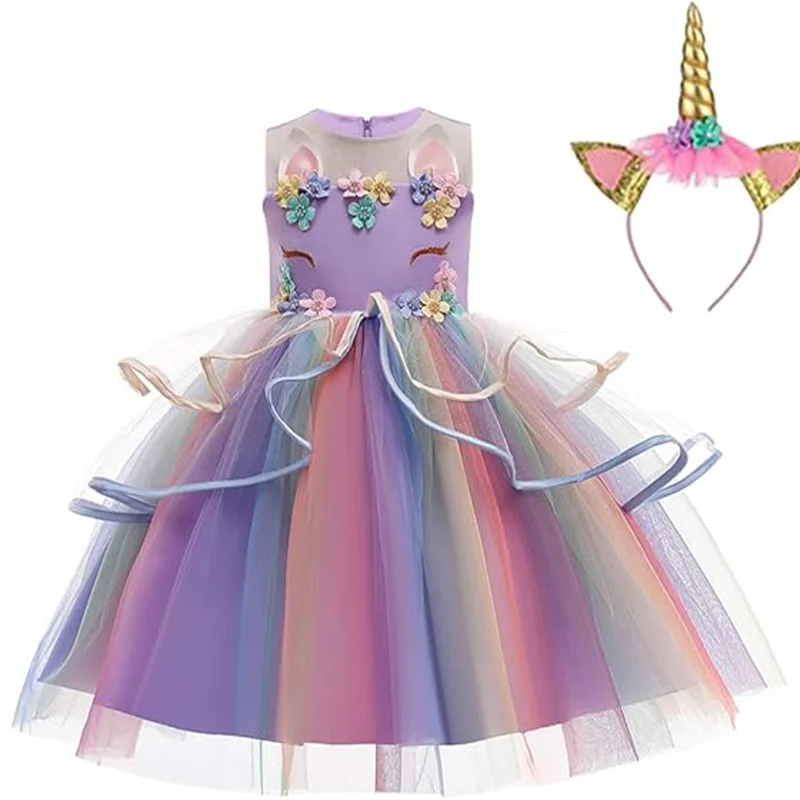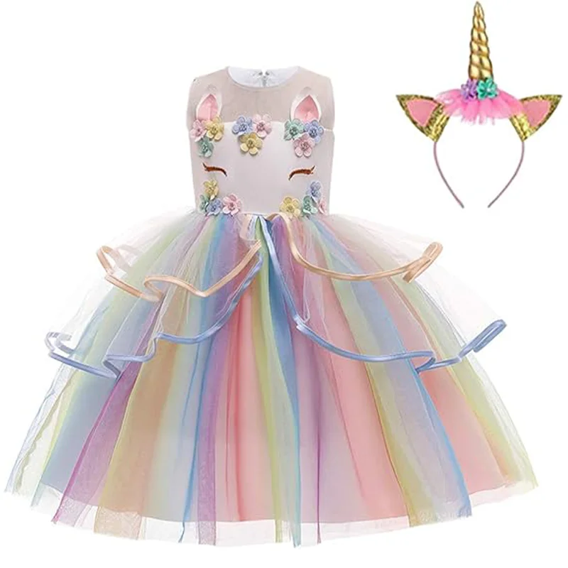 Sonhador menina bordado sem mangas unicórnio malha vestido de princesa com argola de cabelo asa para crianças festa desempenho presente de aniversário 2-10t