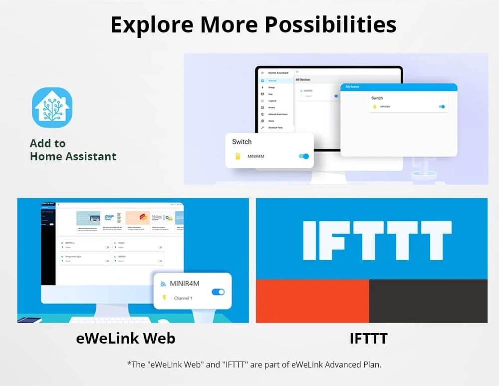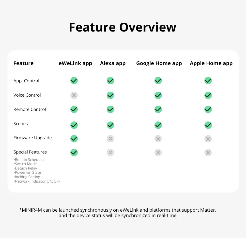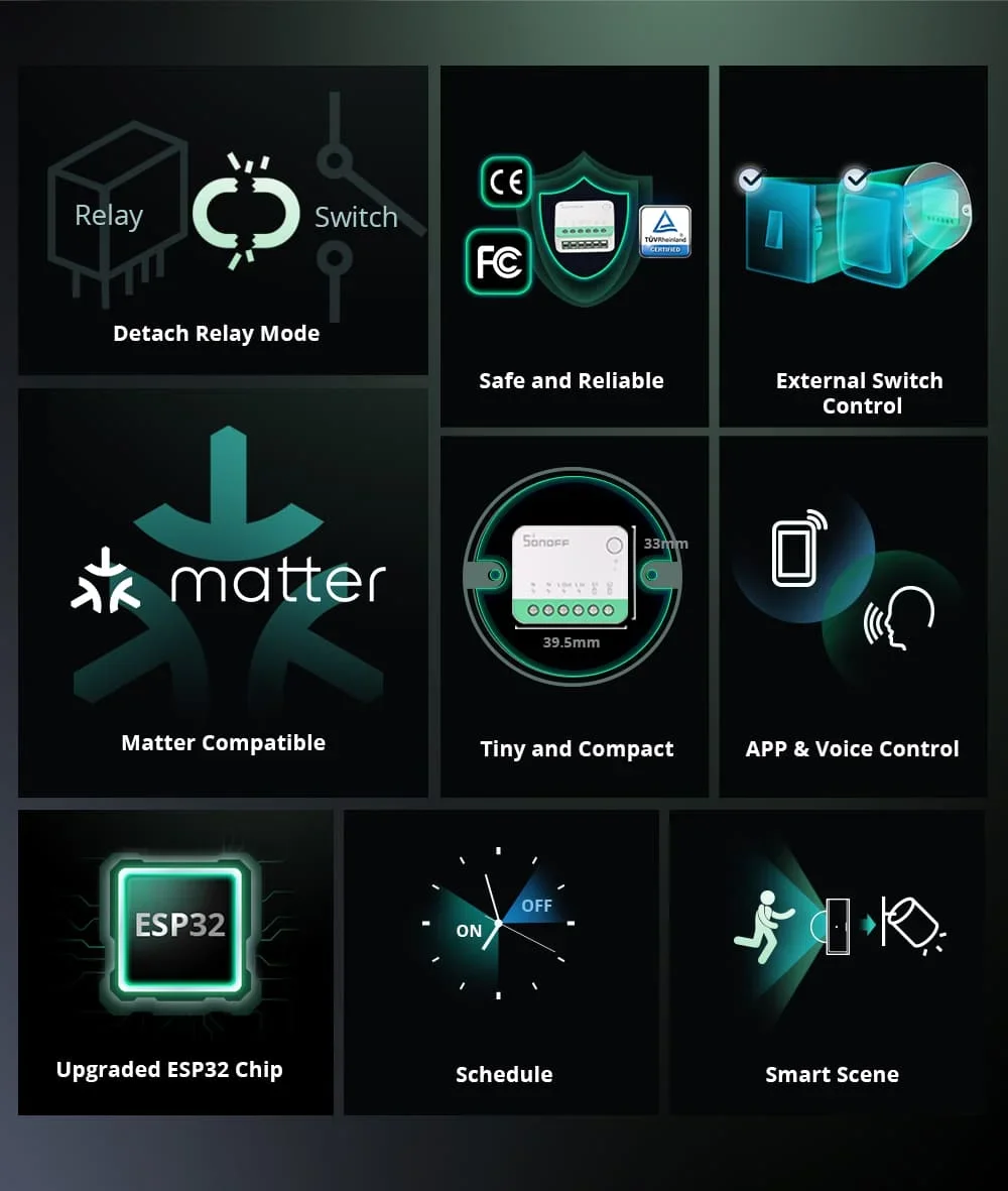 【Compatível com Matter】O SONOFF MINIR4M é um dispositivo certificado pela Matter, compatível com outros dispositivos finais Matter de diferentes marcas e integrável em plataformas habilitadas para Matter, como Alexa, Apple Home, Google Home, etc.Controlar todos os dispositivos inteligentes através de um aplicativo não é mais uma fantasia.