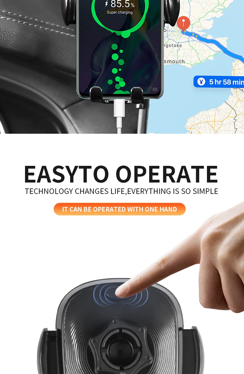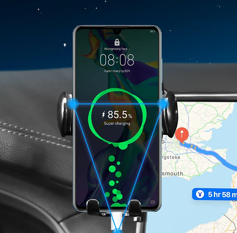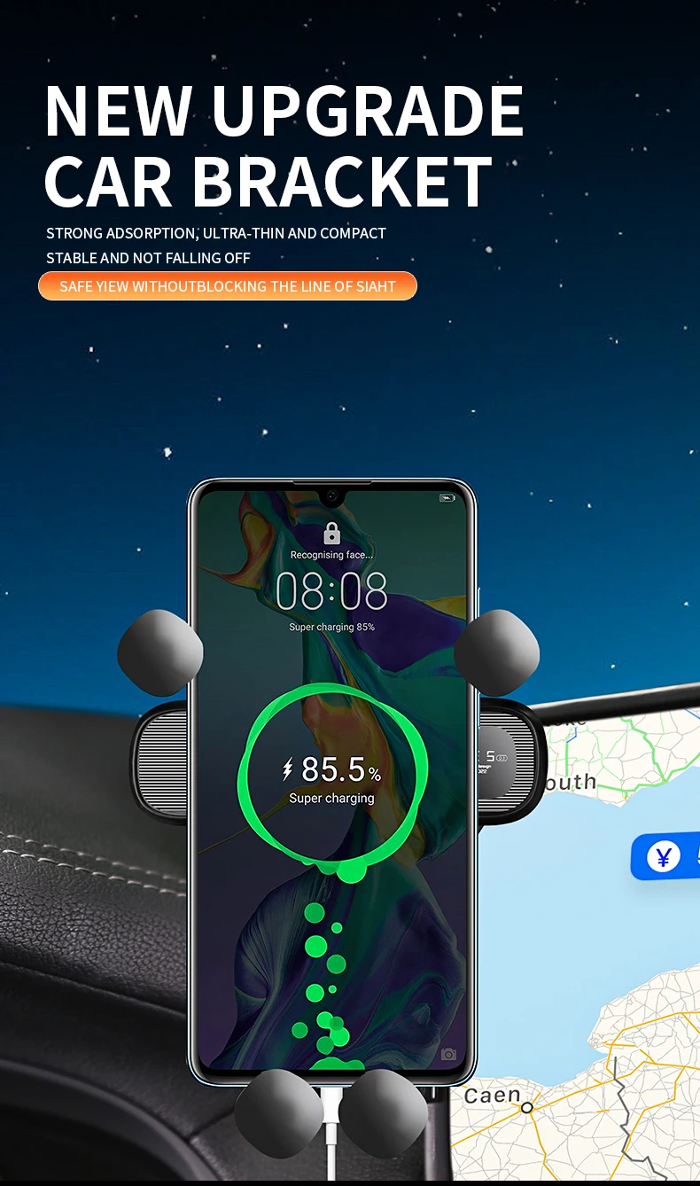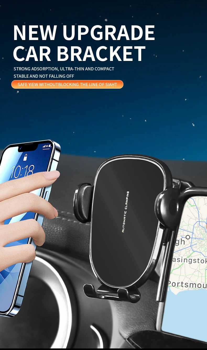 O suporte também funciona como uma base de carregamento sem fio, permitindo que você carregue seu telefone enquanto ele está firmemente no lugar.