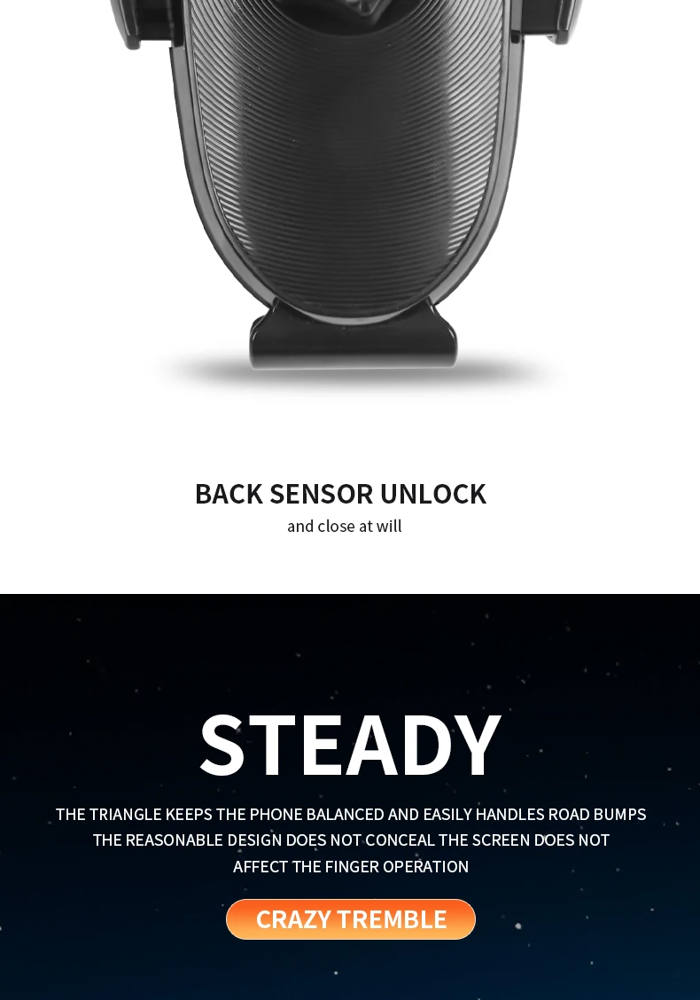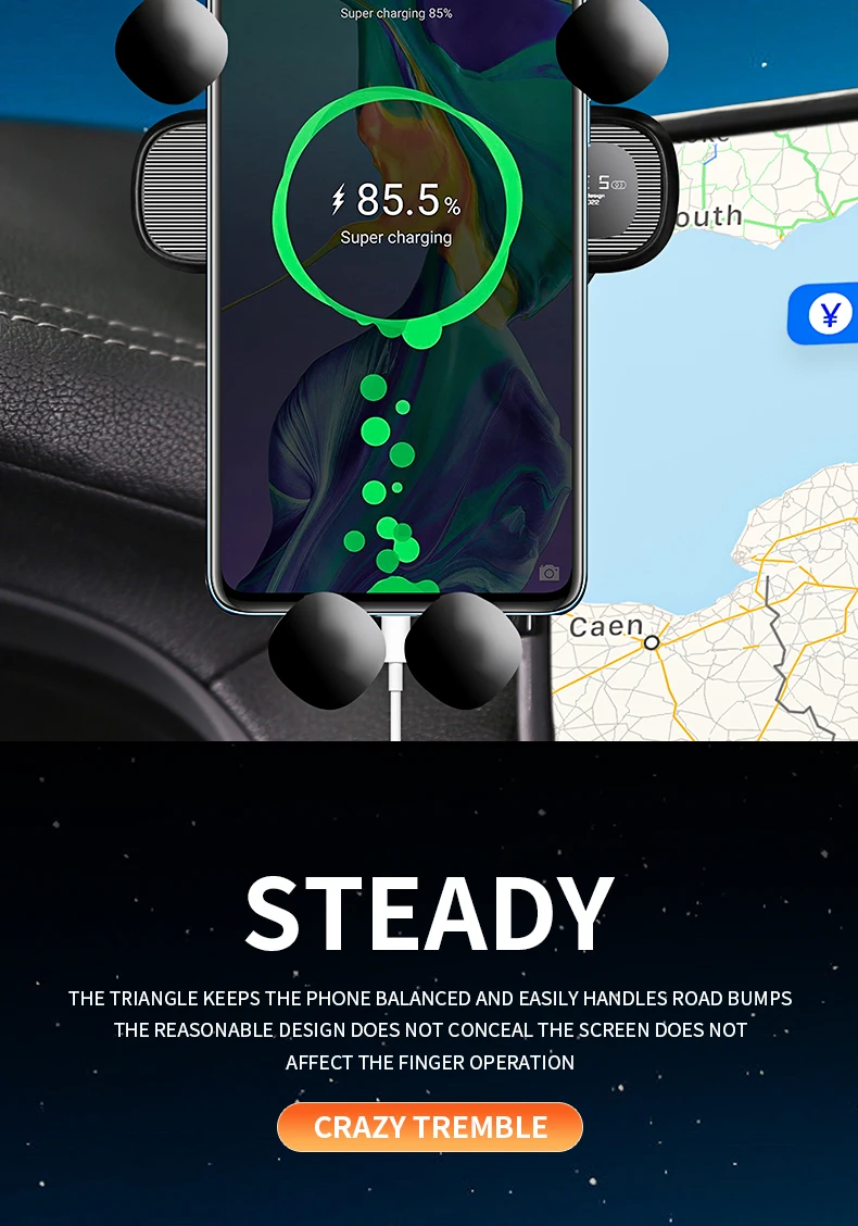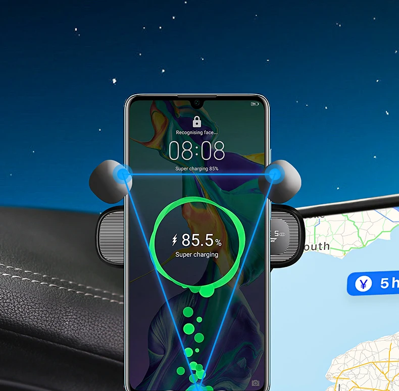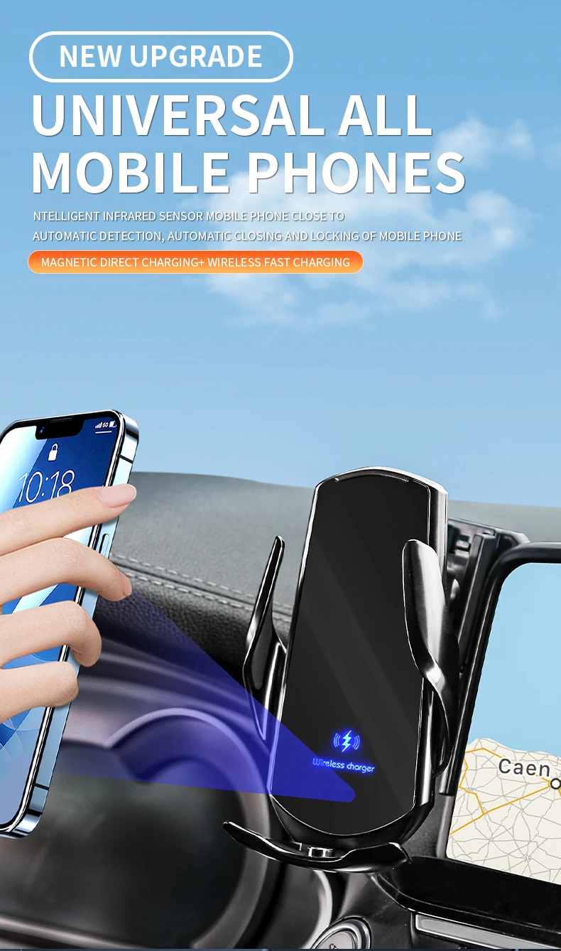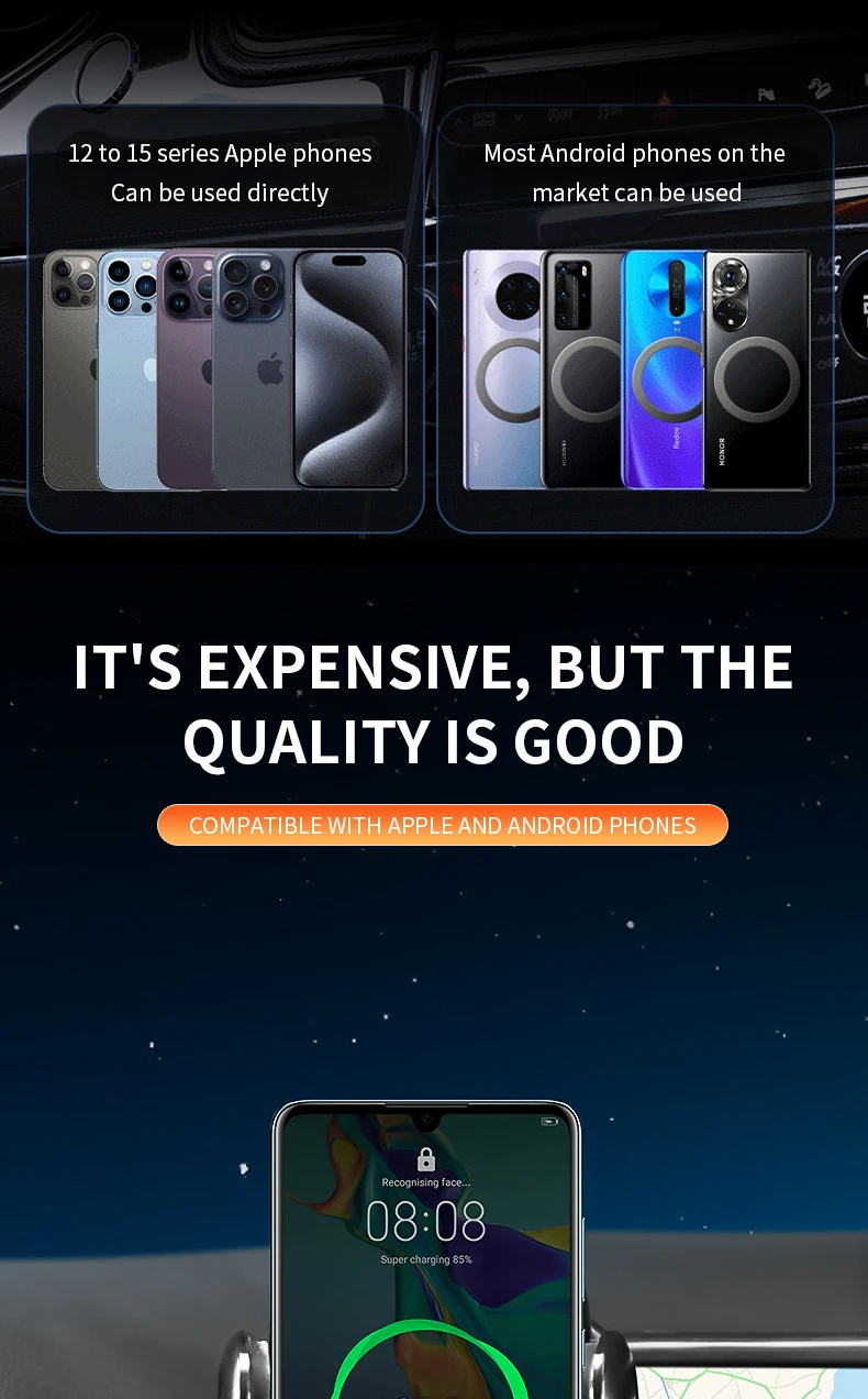O suporte também funciona como uma base de carregamento sem fio, permitindo que você carregue seu telefone enquanto ele está firmemente no lugar.
