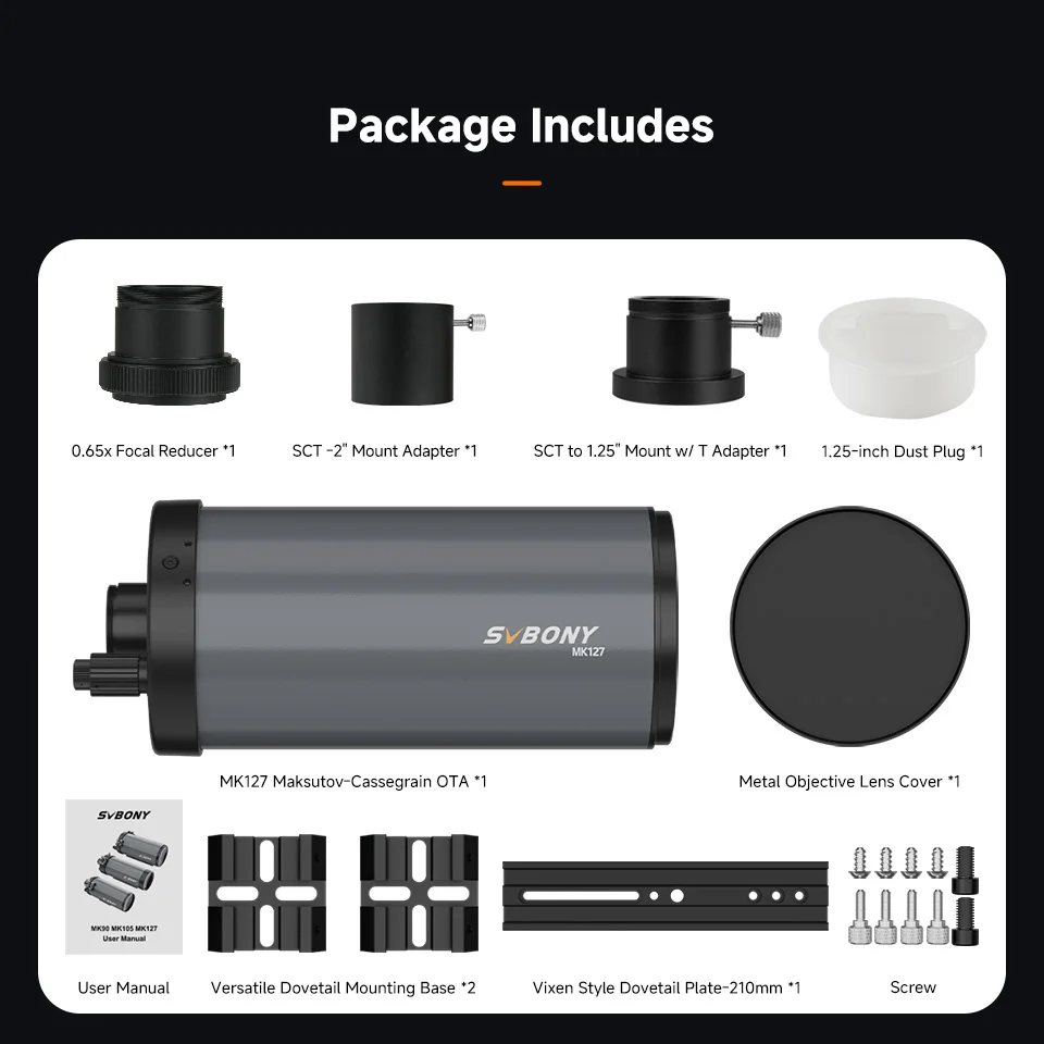 O Svbony MK127 Maksutov-Cassegrain OTA possui uma abertura efetiva de 127mm e uma razão focal de 11.8, que pode ser reduzida para 7.15 com um redutor de 0.65x.Apresentando revestimentos dielétricos de alta refletância de 99%, um design de campo plano integrado e uma estrutura Maksutov de três elementos, oferece uma escolha de interfaces de ocular de 2 ou 1,25 polegadas.Não é apenas adequado para fotografia ou observação planetária tradicional, mas também capaz de capturar pequenas nebulosas ou aglomerados de estrelas.