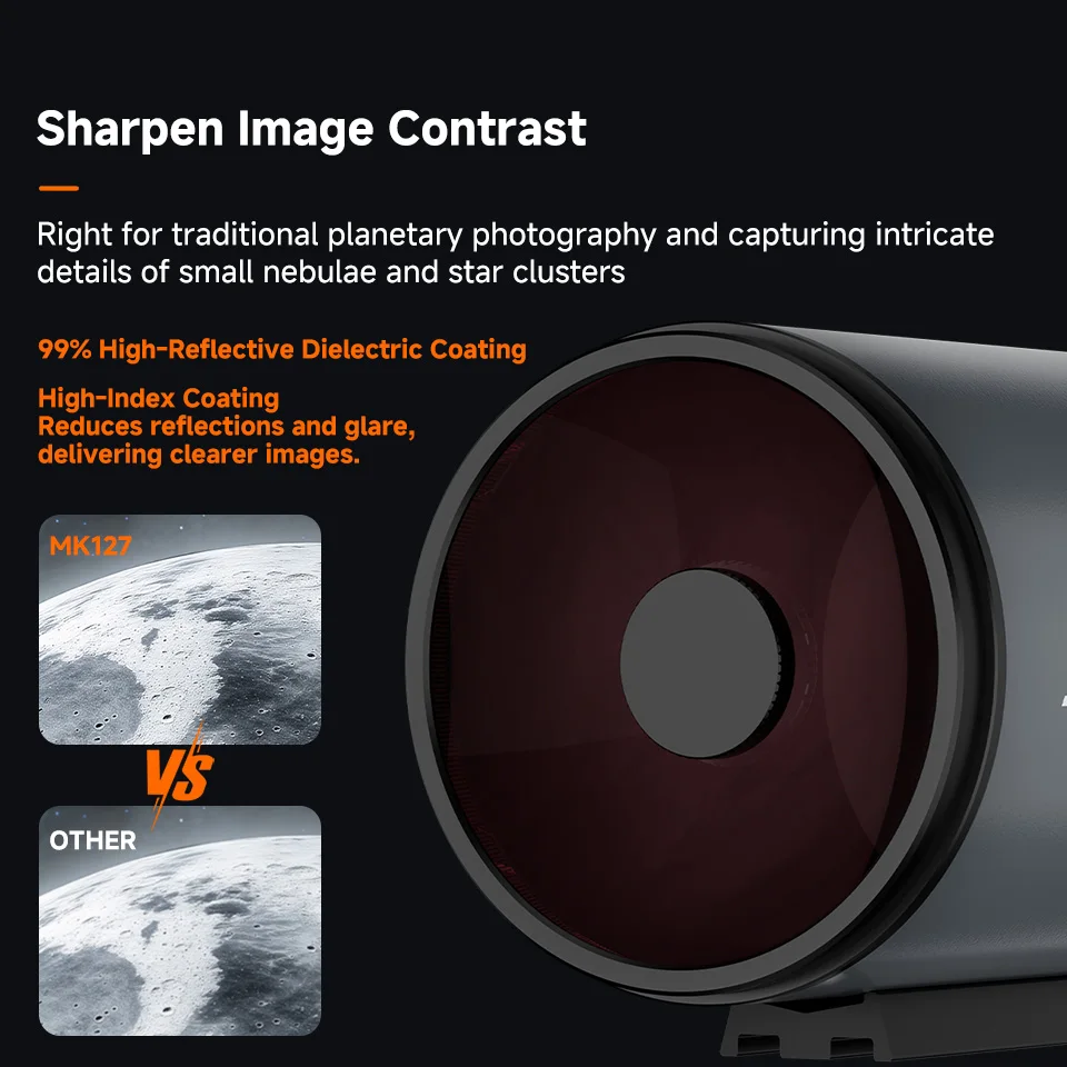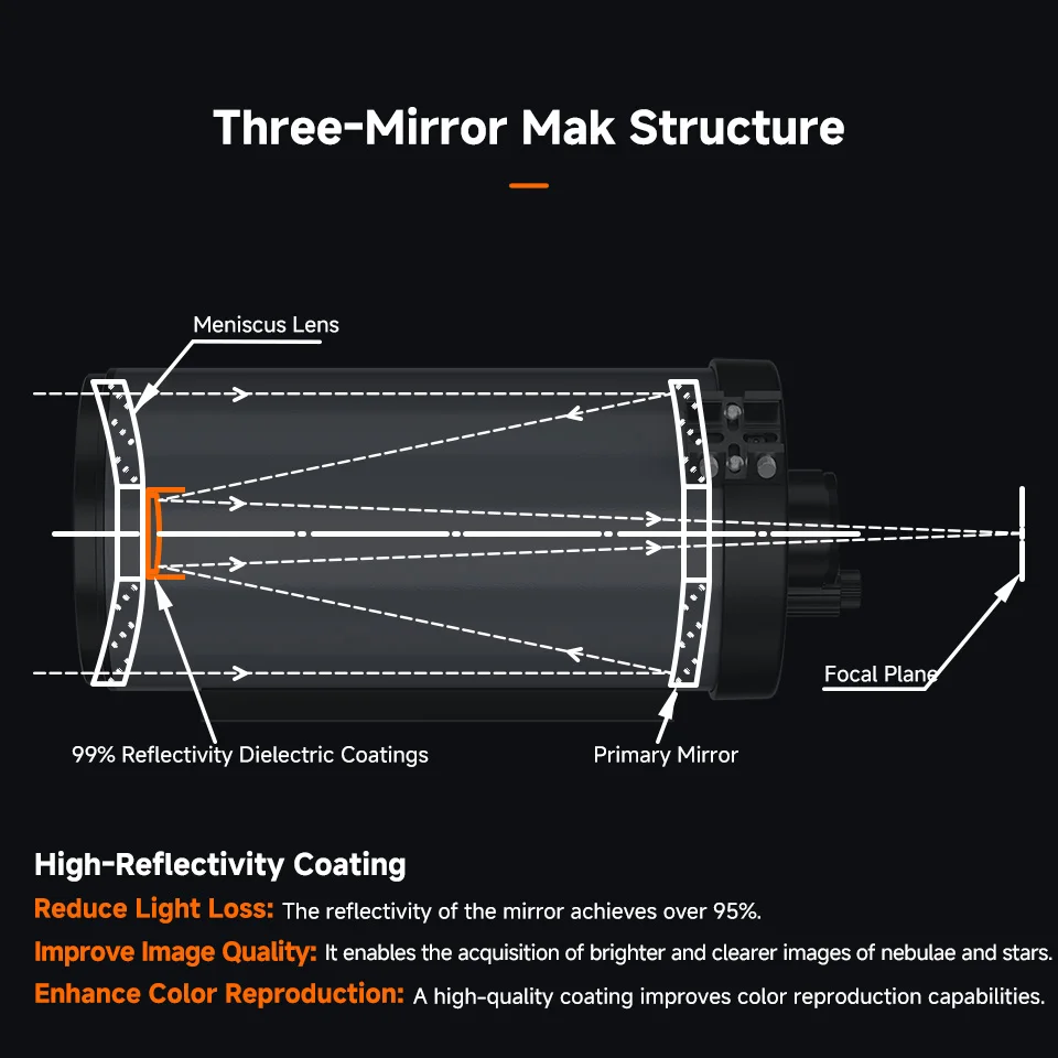 Qualidade de imagem excepcional: o design de campo plano integrado do Maksutov Cassegrain OTA e a estrutura Maksutov-Cassegrain de três elementos; esta combinação corrige coma e astigmatismo, garantindo imagens de estrelas nítidas em todo o campo de visão.