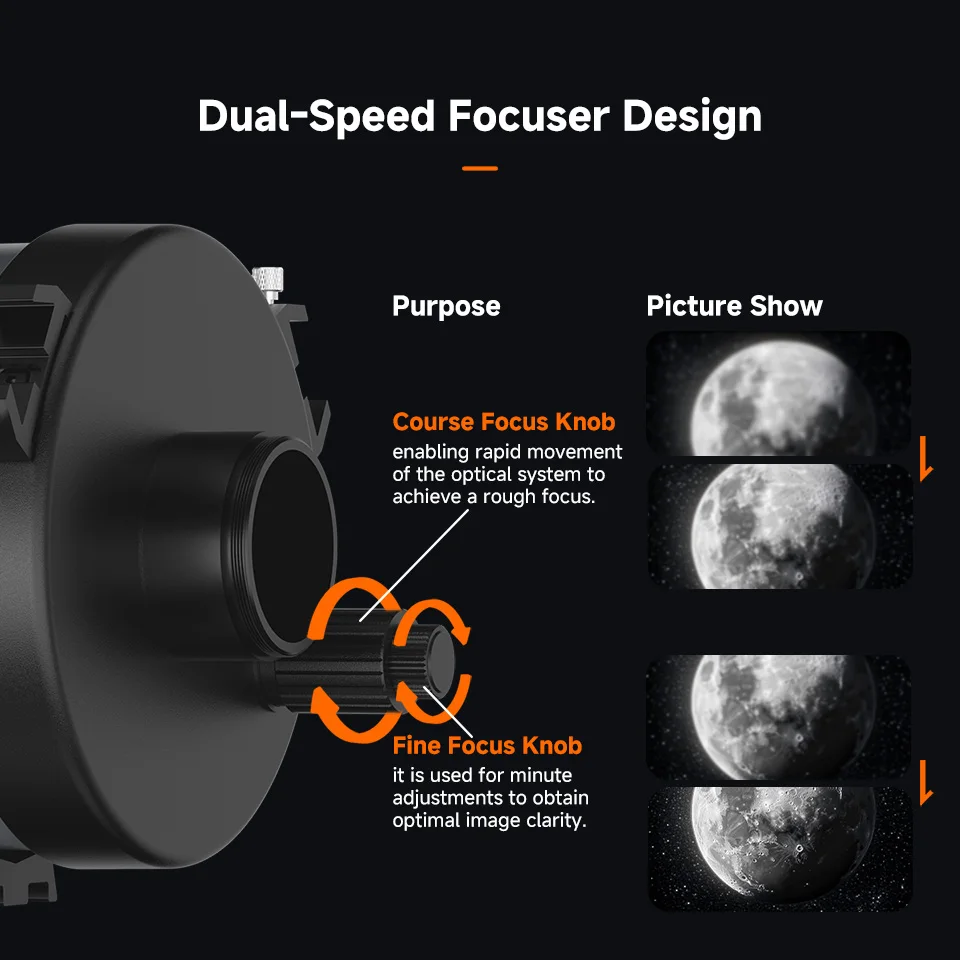 Obtenha foco preciso: com facilidade usando o mecanismo de foco intuitivo de dupla velocidade do Catadioptric Telescope OTA; permitindo um foco inicial rápido; enquanto o botão de ajuste fino permite ajustes meticulosos para imagens nítidas