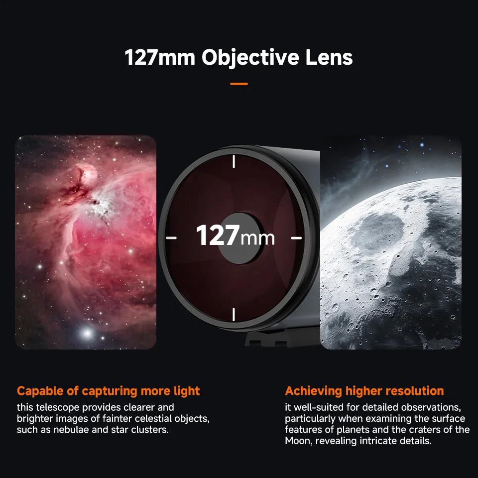 Experimente a clareza das maravilhas celestes: com a abertura efetiva de 127mm meticulosamente projetada do telescópio MAK; aliada a uma razão focal de f/11.8; capturando objetos do céu profundo com detalhes impressionantes e aberração mínima.