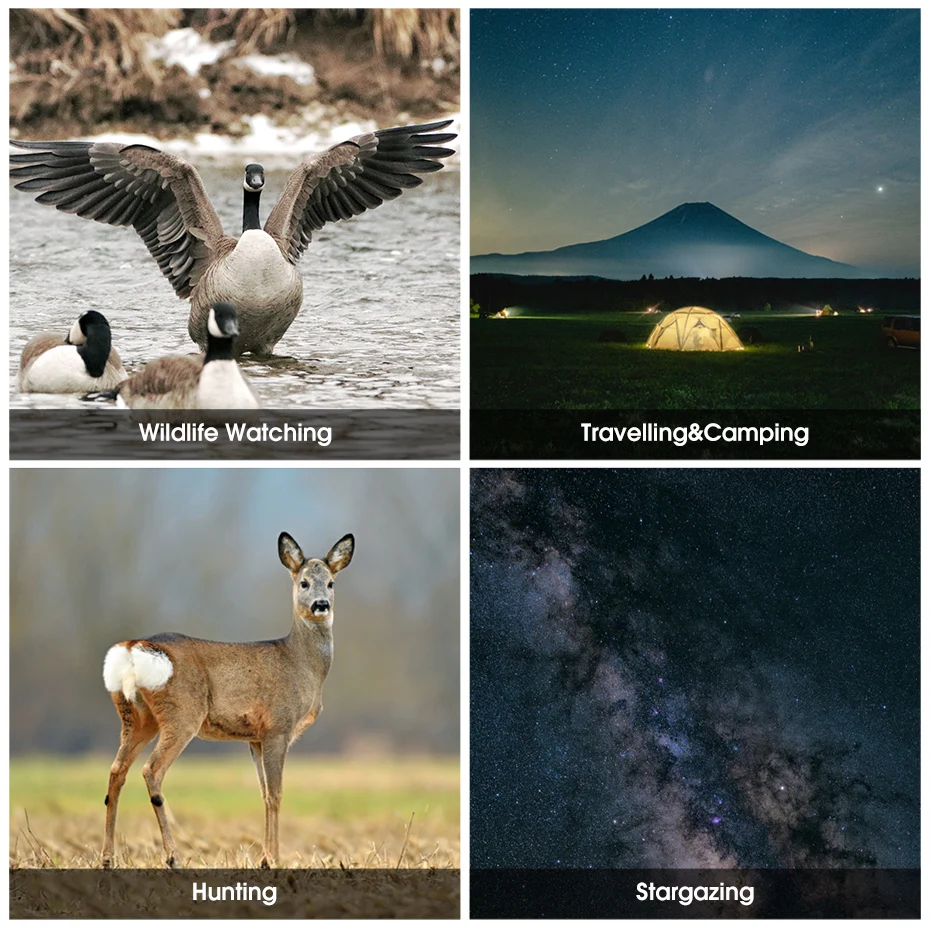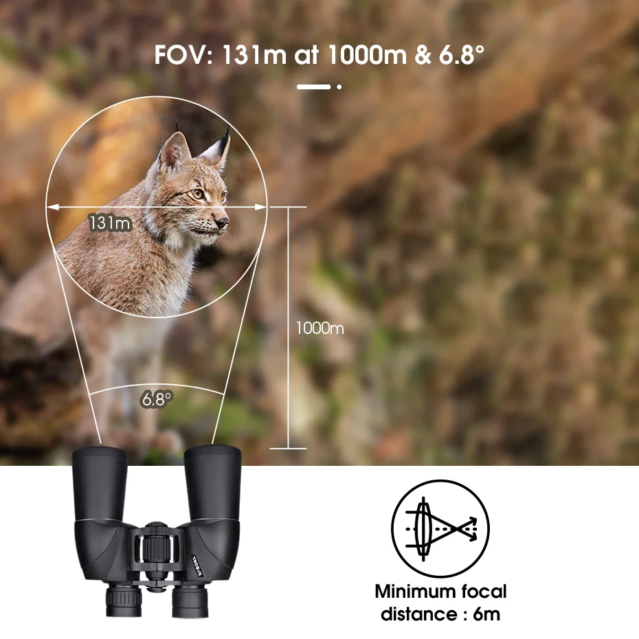 O amplo campo de visão: 131m a 1000m facilita a localização de objetos em movimento (como animais de corrida) quando você escanea de longe.Esse grande campo de visão também permite mais luz, para que as imagens fiquem mais brilhantes.A distância focal mínima é de 6m.