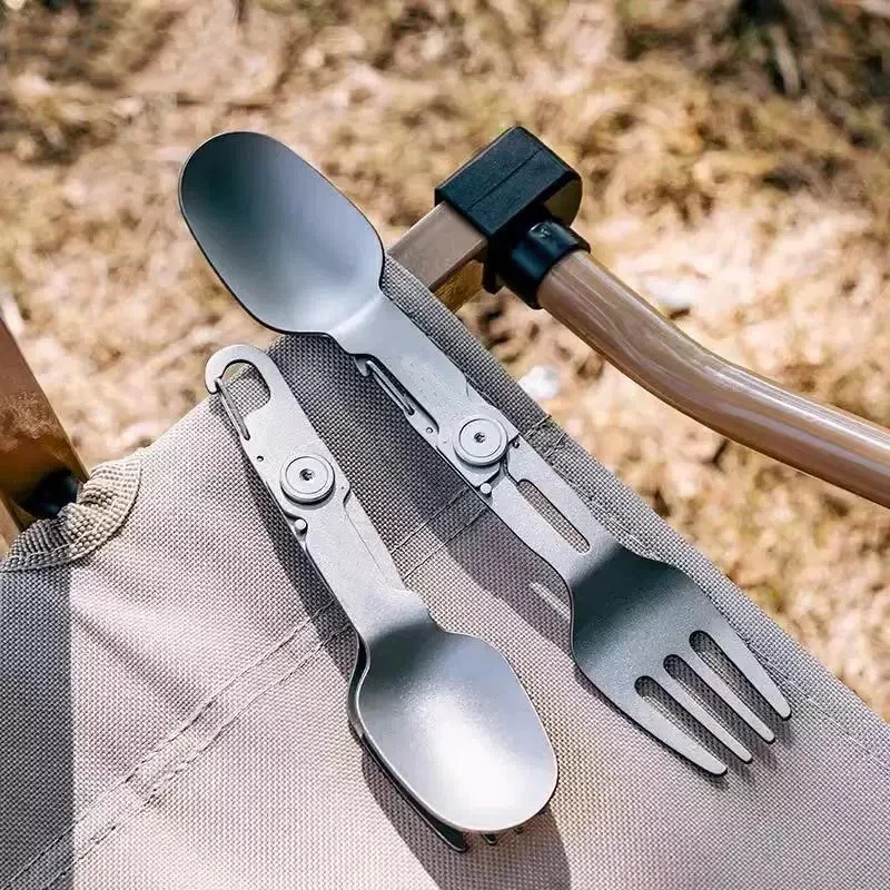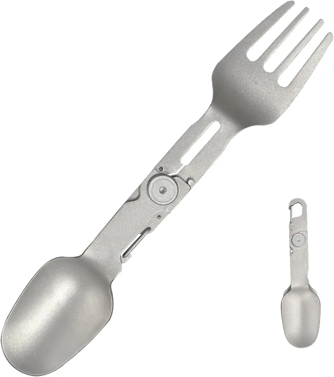 Talheres de titânio puro multifuncionais 2 em 1 com combinação de colher dobrável e garfo, perfeito para caminhadas, camping ou viagens de mochila