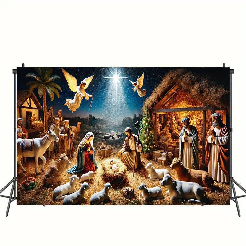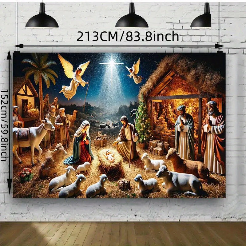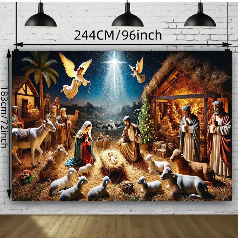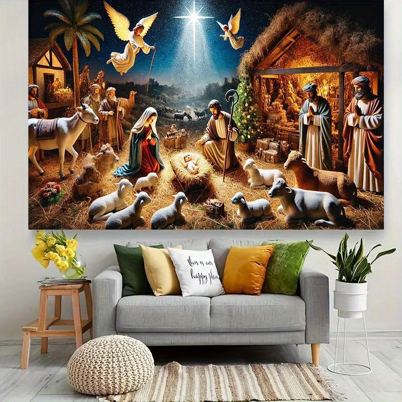 Tapeçaria de presépio de Natal, Noite estrelada com estáveis e animais, arte de parede para decoração de casa de férias e celebração religiosa