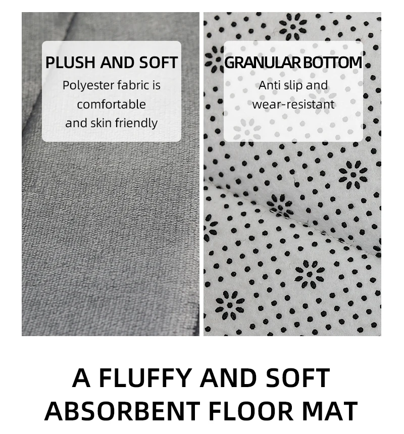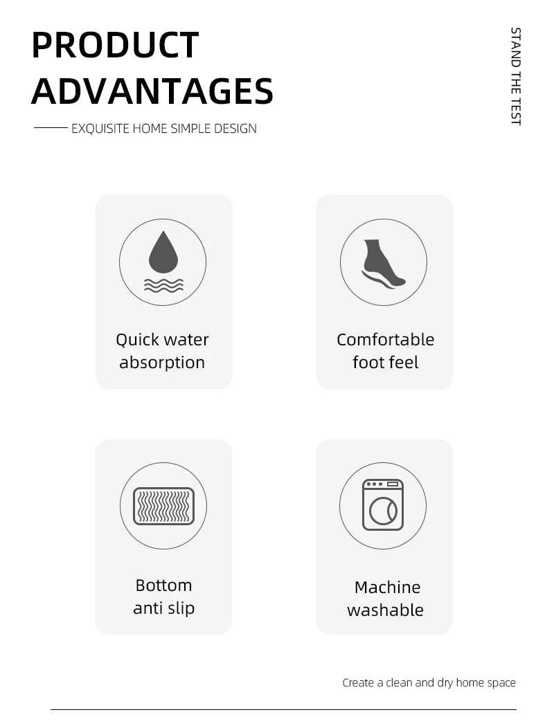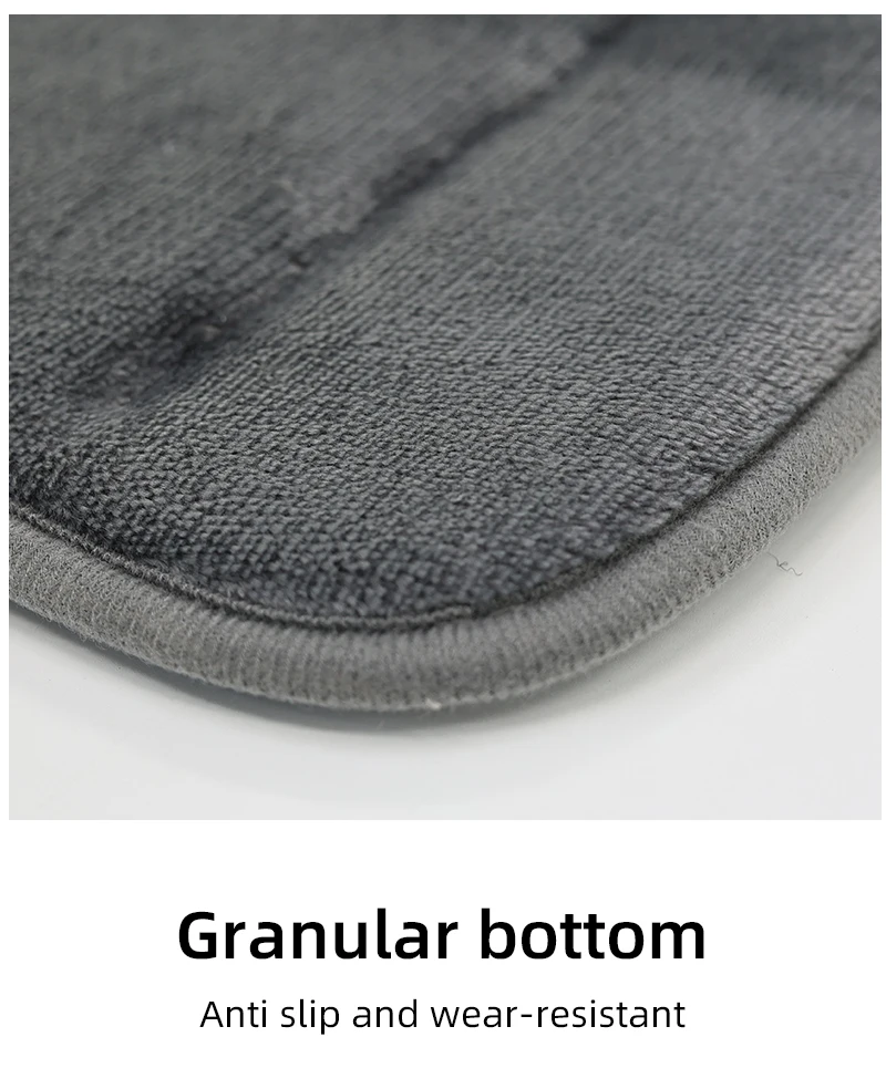 • Absorção rápida de água:O tapete possui um mecanismo de rápida absorção de água, garantindo que o banheiro permaneça limpo e seco.Esse recurso também evita escorregões e quedas.