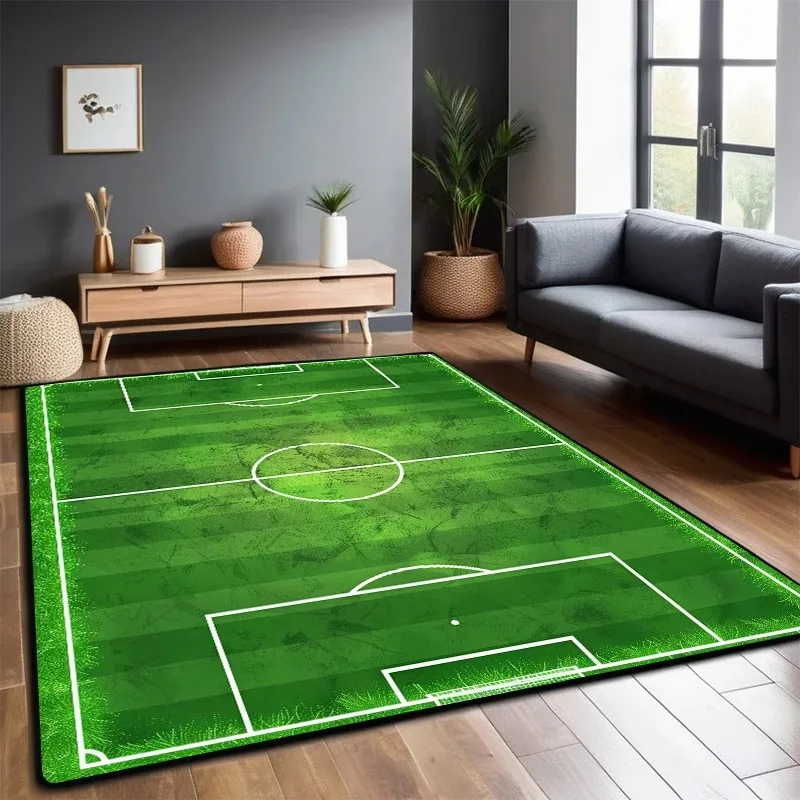 Tapete grande para sala de estar com tema de campo de futebol, grama verde, branco, design de linha de campo de futebol, tapete antiderrapante para decoração de casa