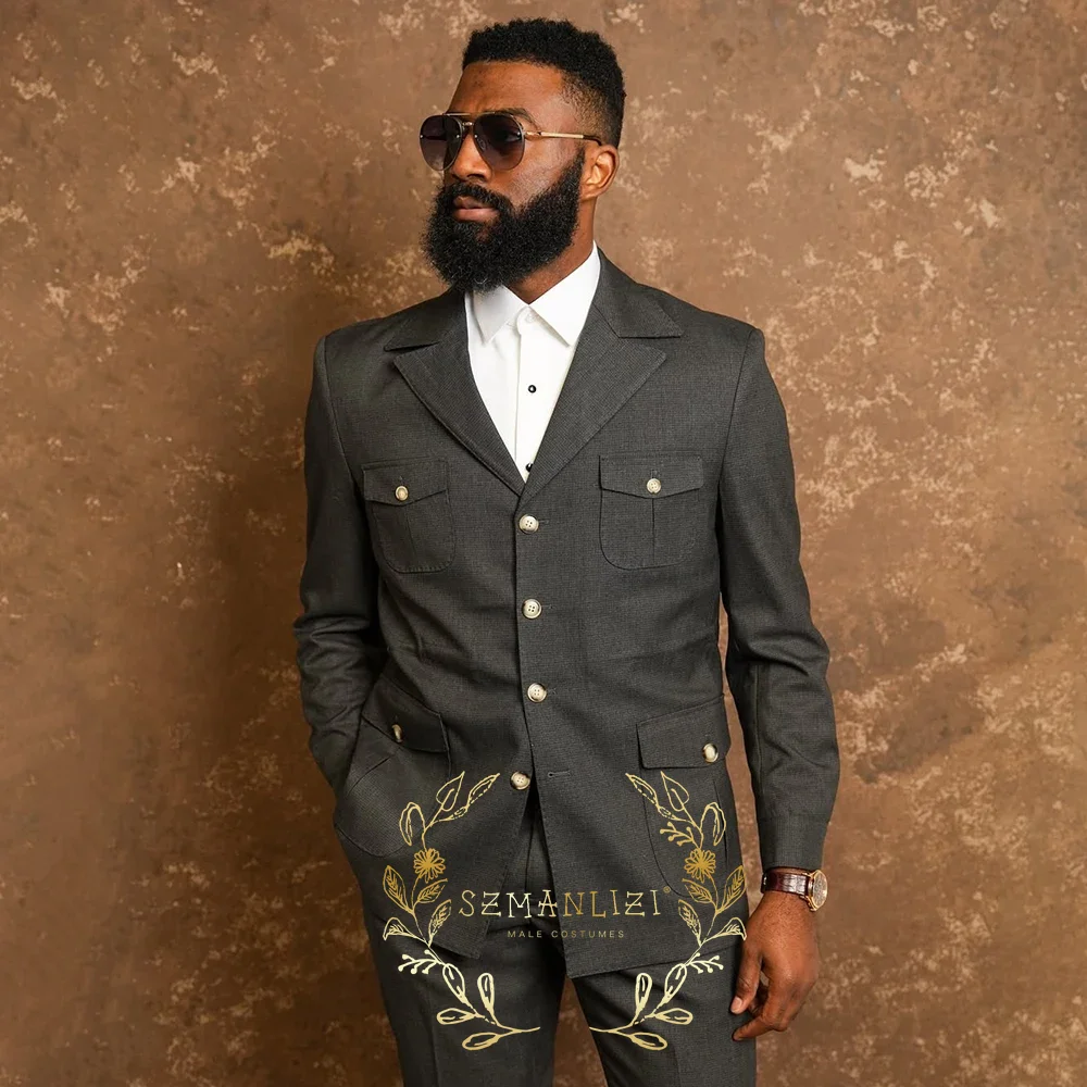- > Ternos Masculinos Cinza Escuro Africano da Moda, Abotoamento Simples, Lapela Entalhada, Corte Slim, Roupa Masculina Personalizada, Conjunto de 2 Peças: Jaqueta e Calça