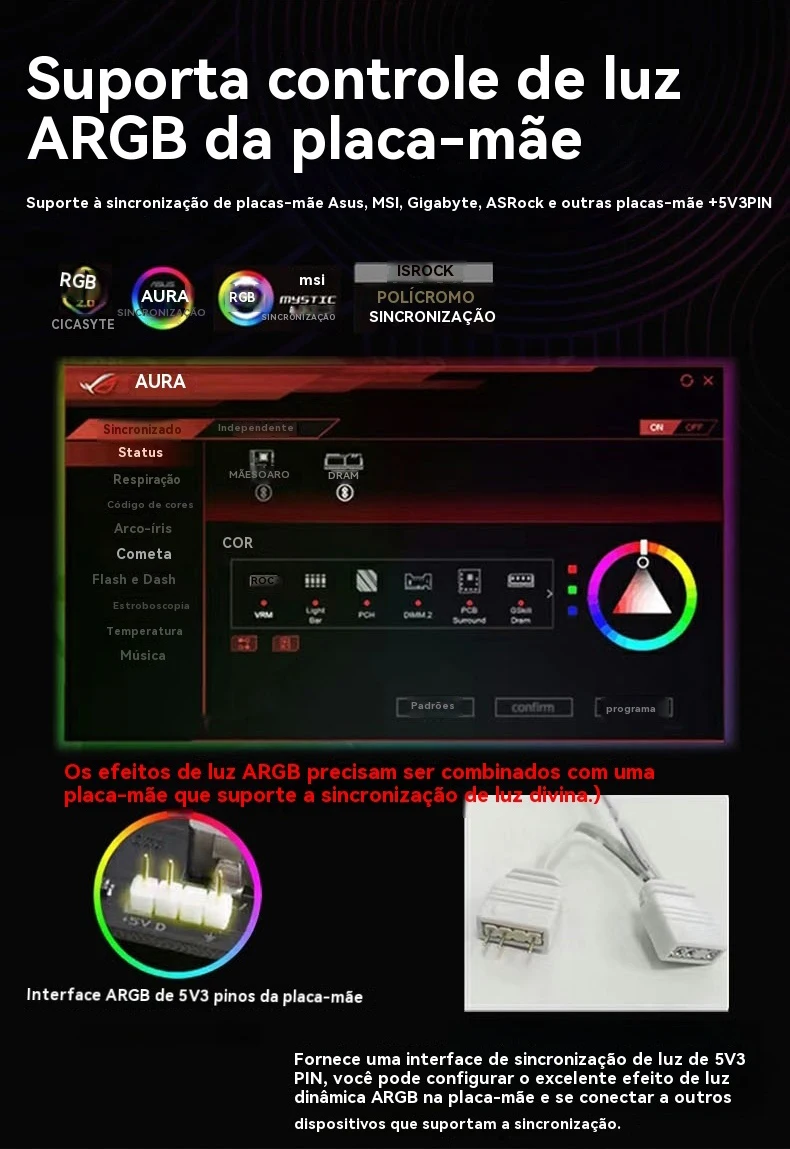 Suporta ASUS, MSI, Gigabyte, Asrock, etc. +5V 3pin Sincronização da placa -mãe Provide 5v3pin A interface de sincronização de Shengung, que pode definir excelentes efeitos de iluminação dinâmica de Argb na placa -mãe e conectar -se a outros dispositivos que suportam sincronização