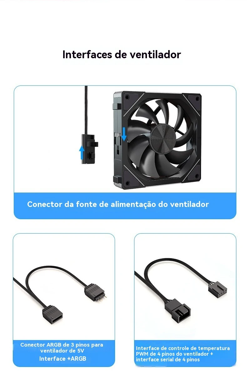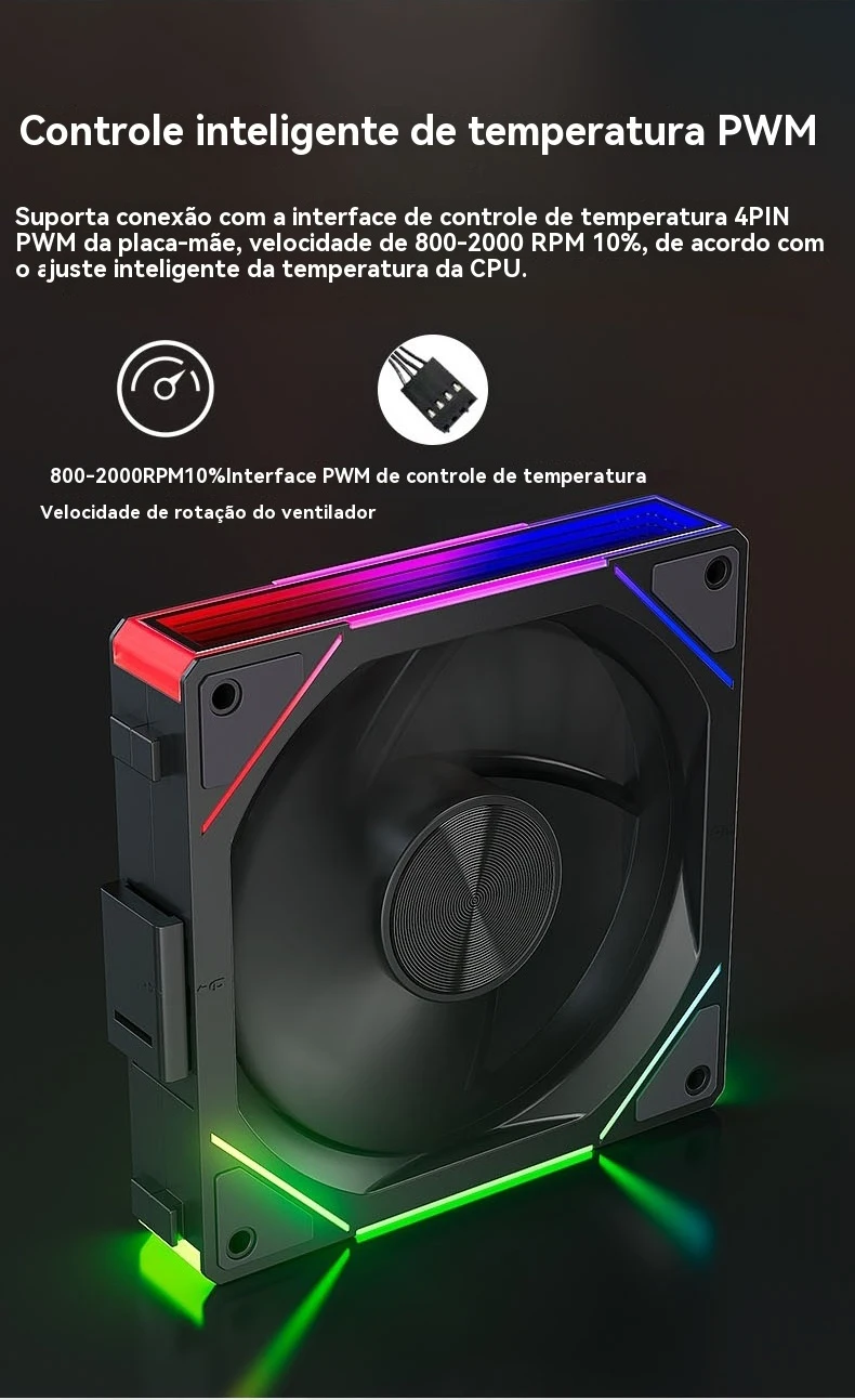 Suporta a conexão com a interface de controle de temperatura da placa-mãe 4pinpwm, velocidade de rotação 800-2000rpm ± 10%, ajustada de forma inteligente de acordo com a temperatura da CPU