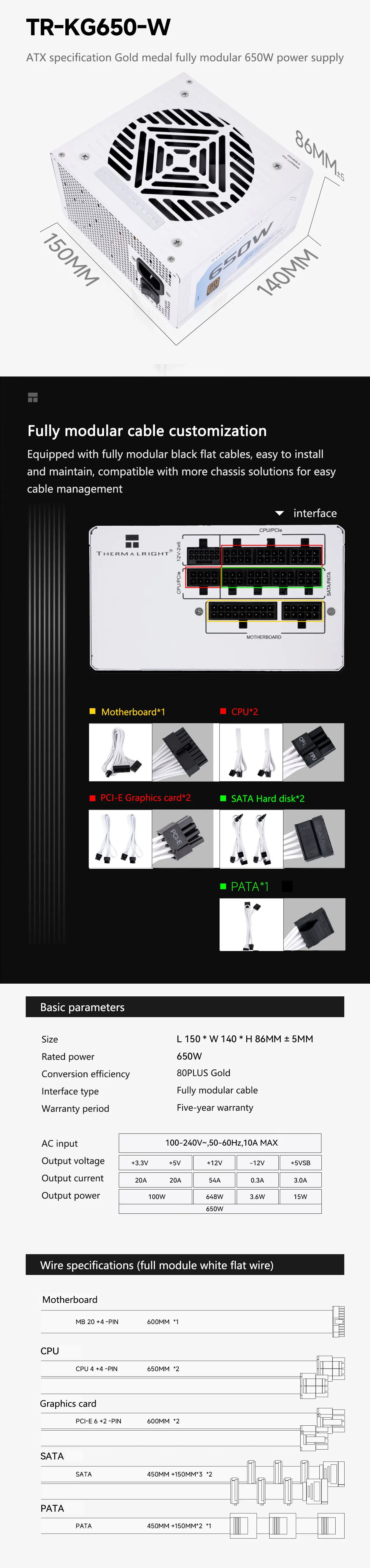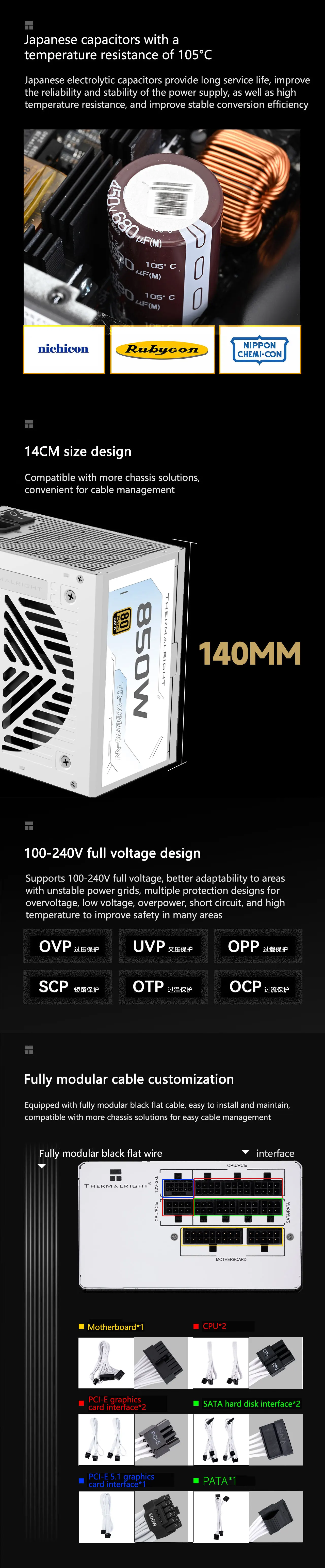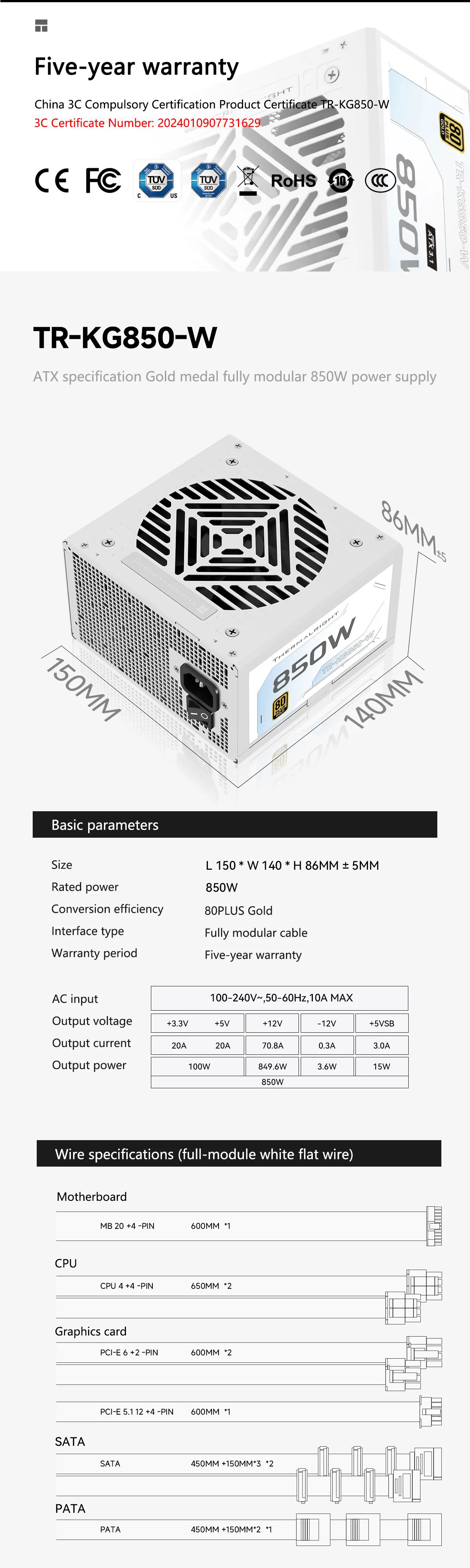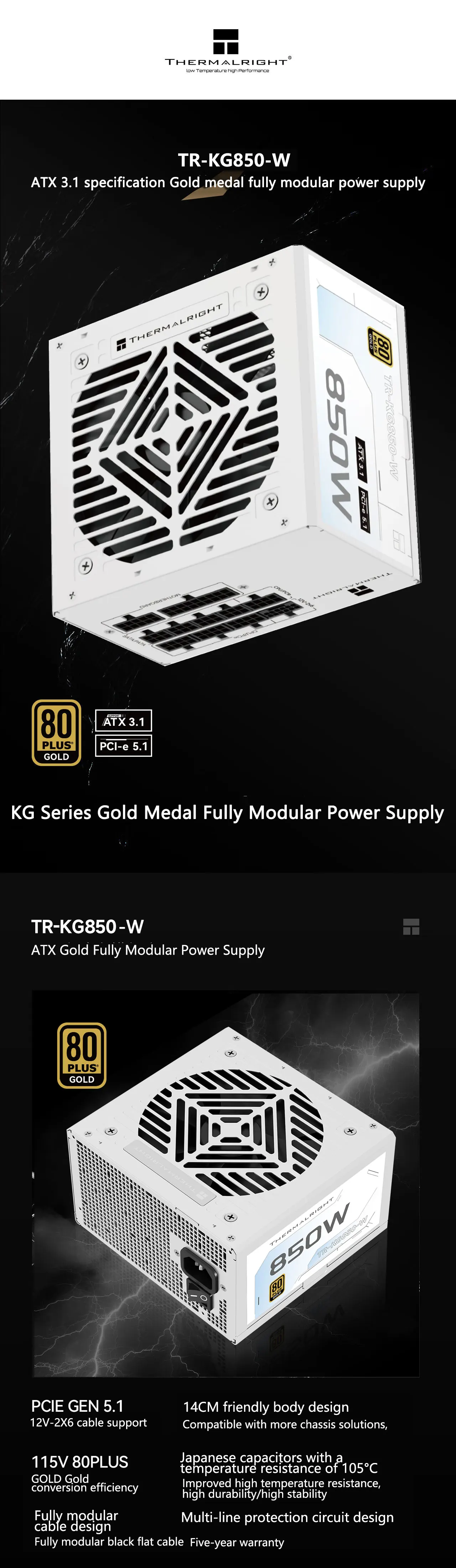 - > Thermalright TR-KG850-W Branco ATX3.1 PCI-E 5.1 PSU Fonte de alimentação totalmente modular dourada 650W/750W/850W 650W não suporta PCI-E 5.1