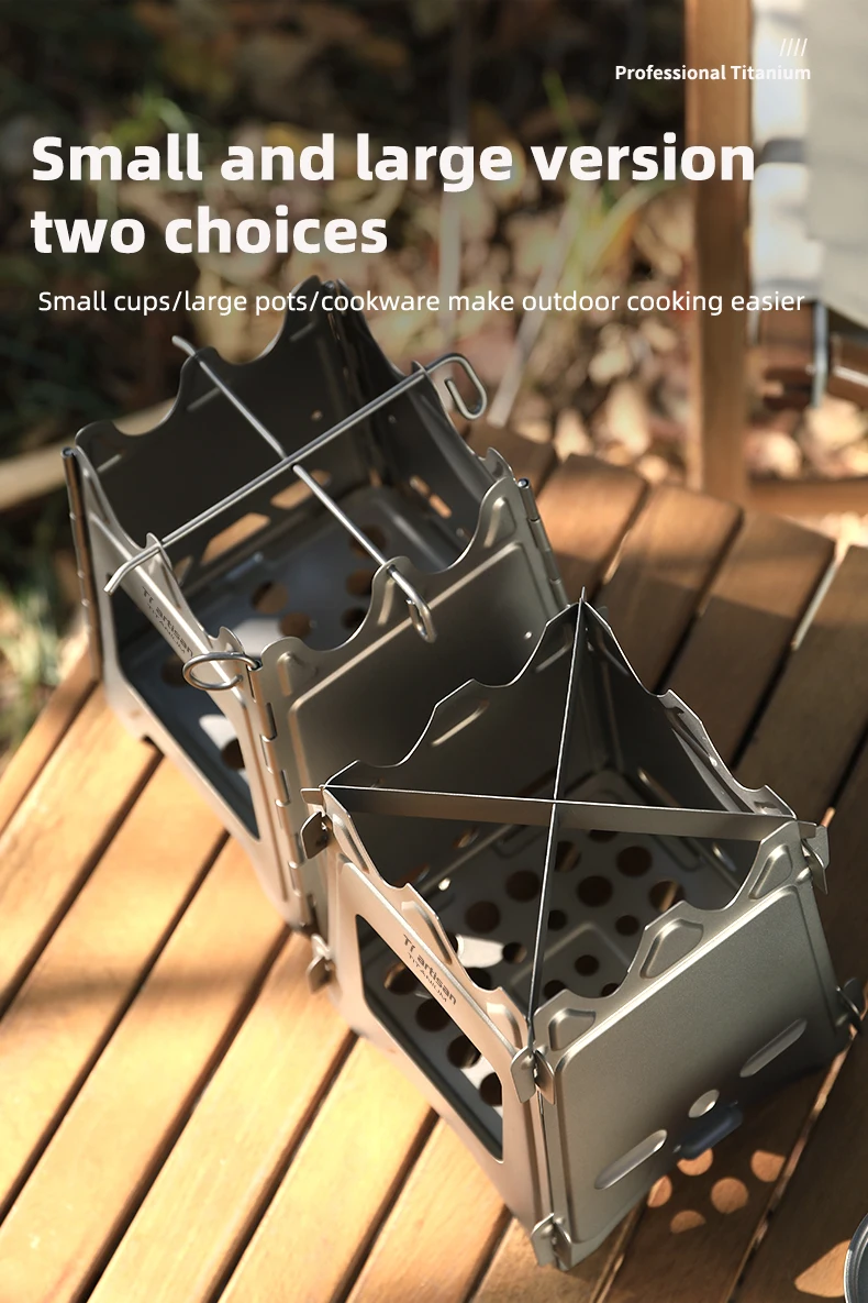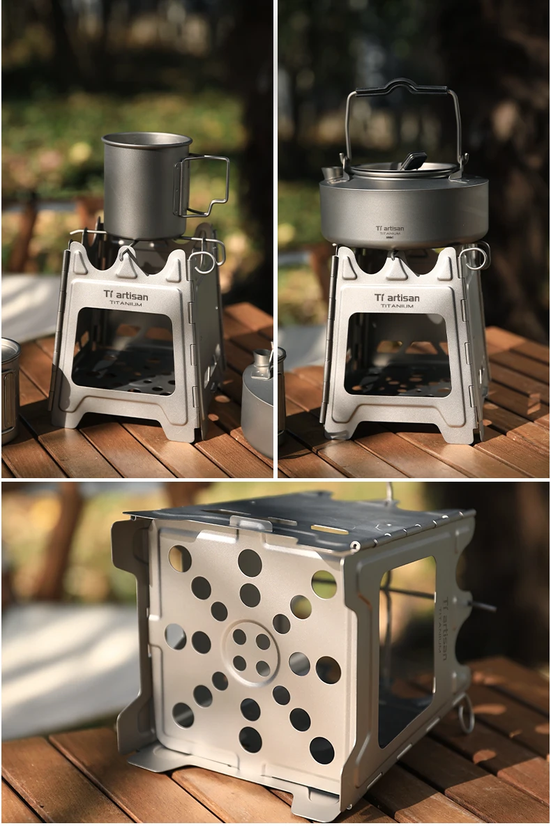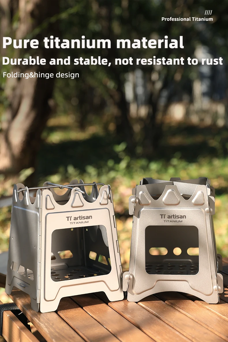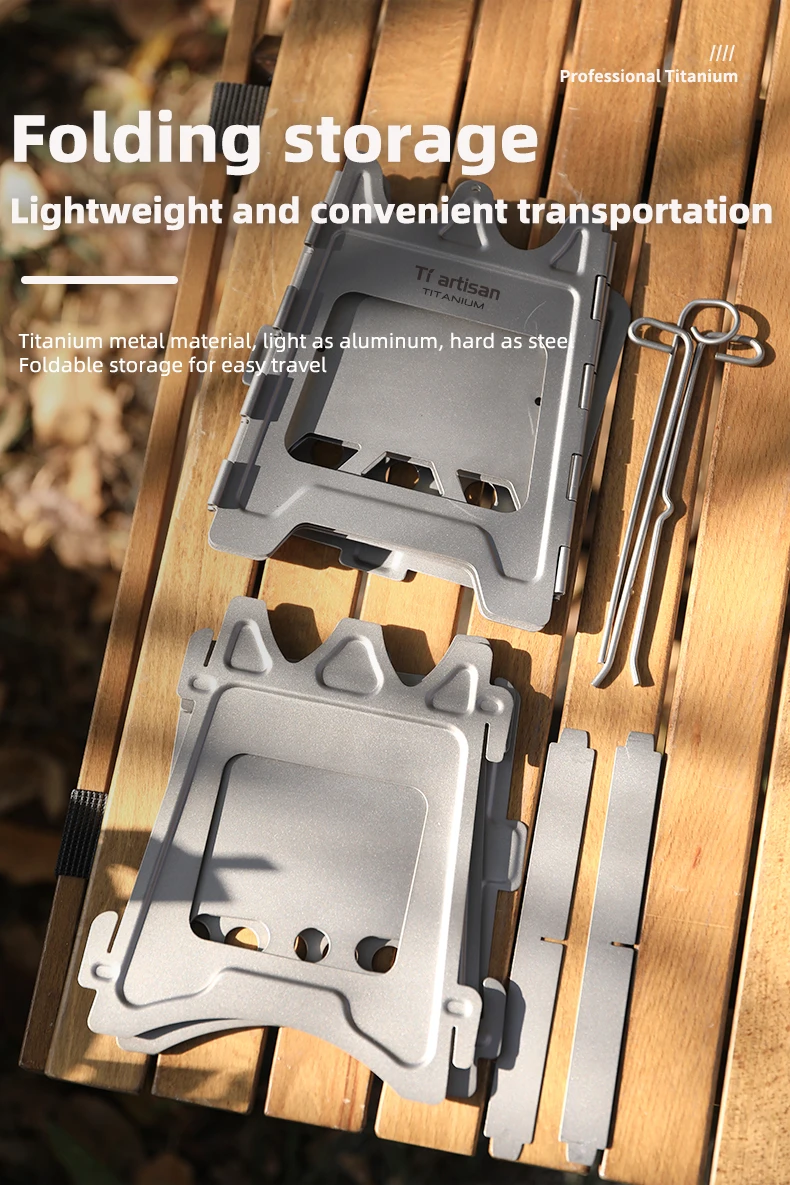 Nome do produto: titânio/aço inoxidável dobradiça dobrável design acampamento fogão a lenha portátil fogão a carvão