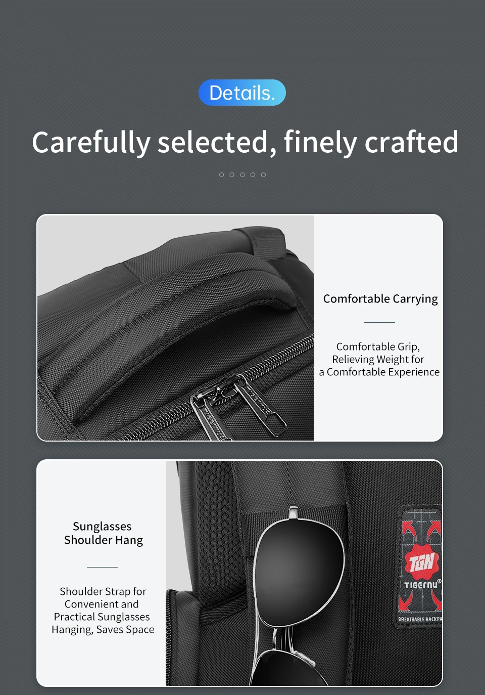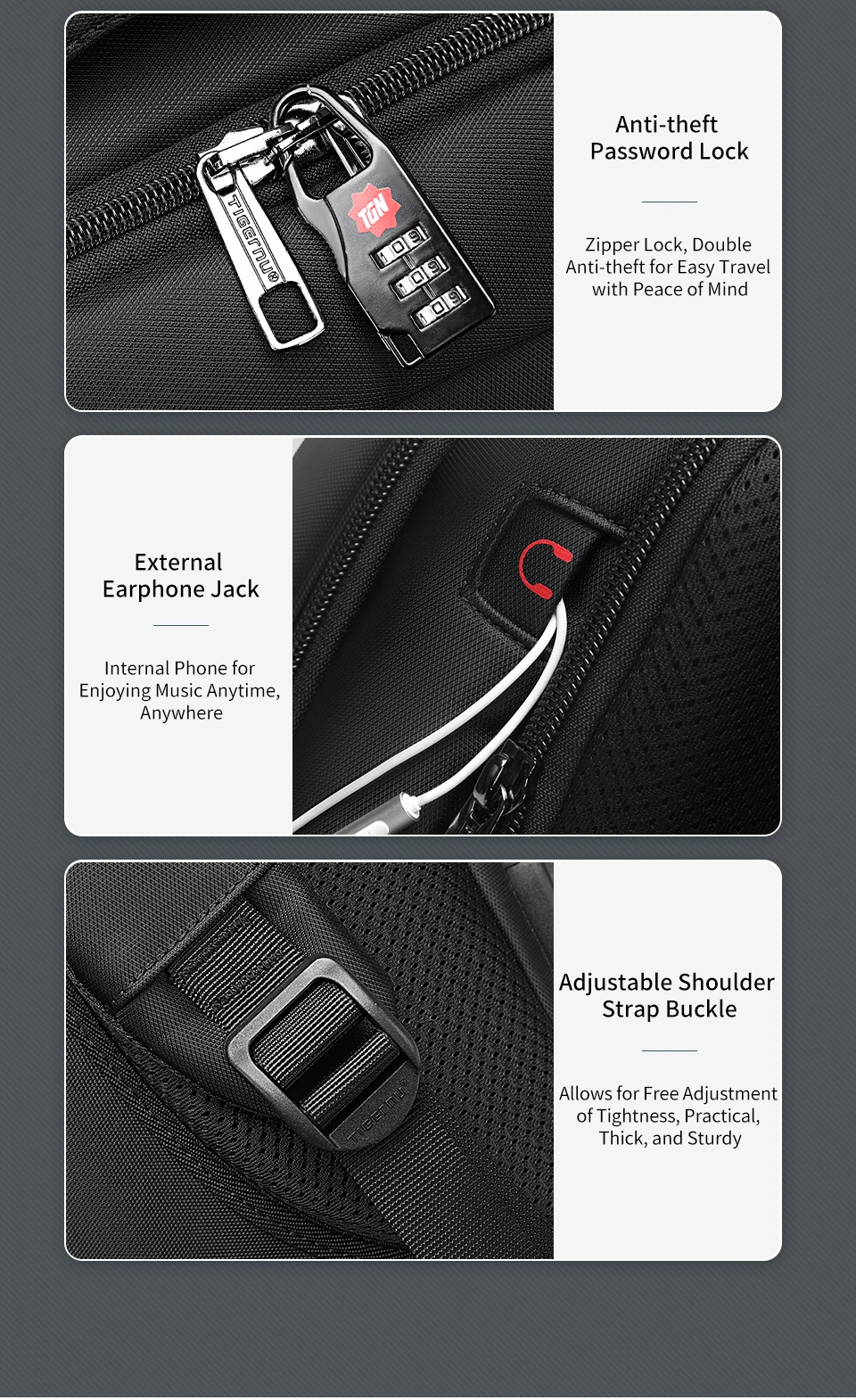 5. Outros detalhes convenientes de design, como alça de ombro reforçada, design de cinto de fixação de haste de tração, alça confortável, alça de ombro curva; almofada de ar respirável em favo de mel, entrada de fone de ouvido conveniente, bolso para cartão na alça de ombro etc.